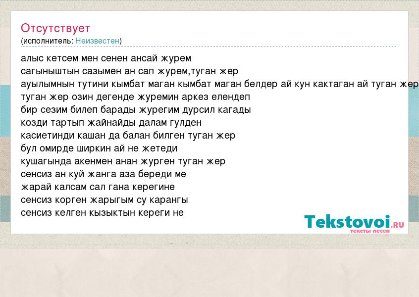 алыс кетсем мен сенен ансай журем сагыныштын сазымен ан сап журем,туган жер ауылымнын тутини кымбат маган кымбат маган белдер ай кун кактаган ай туган жер туган жер озин дегенде журемин аркез елендеп бир сезим билеп барады журегим дурсил кагады козди тартып жайнайды далам гулден касиетинди кашан да балан билген туган жер бул омирде ширкин ай не жетеди кушагында акенмен анан журген туган жер сенсиз ан куй жанга аза береди ме жарай калсам сал гана керегине сенсиз корген жарыгым су карангы сенсиз келген кызыктын кереги не
