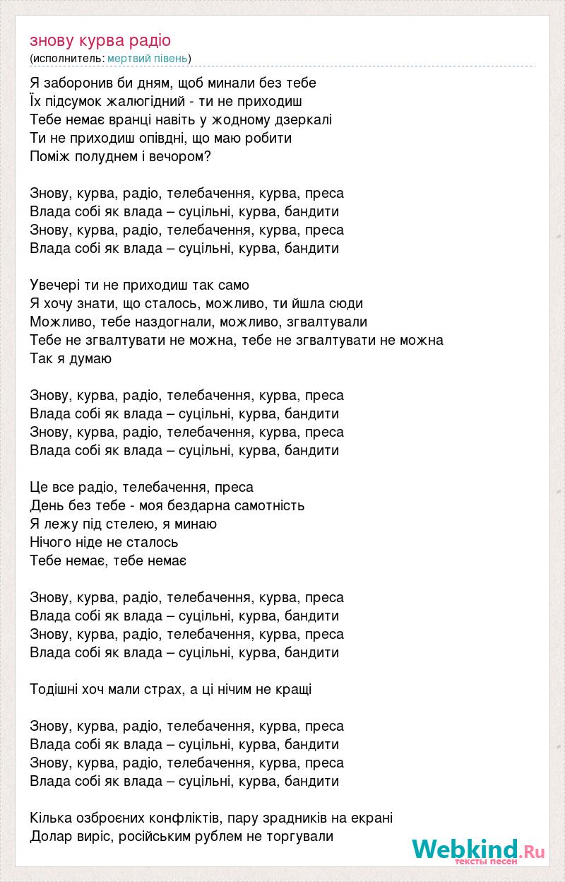 Я заборонив би дням, щоб минали без тебе Їх підсумок жалюгідний - ти не приходиш Тебе немає вранці навіть у жодному дзеркалі Ти не приходиш опівдні, що маю робити Поміж полуднем і вечором? Знову, курва, радіо, телебачення, курва, преса Влада собі як влада – суцільні, курва, бандити Знову, курва, радіо, телебачення, курва, преса Влада собі як влада – суцільні, курва, бандити Увечері ти не приходиш так само Я хочу знати, що сталось, можливо, ти йшла сюди Можливо, тебе наздогнали, можливо, згвалтували Тебе не згвалтувати не можна, тебе не згвалтувати не можна Так я думаю Знову, курва, радіо, телебачення, курва, преса Влада собі як влада – суцільні, курва, бандити Знову, курва, радіо, телебачення, курва, преса Влада собі як влада – суцільні, курва, бандити Це все радіо, телебачення, преса День без тебе - моя бездарна самотність Я лежу під стелею, я минаю Нічого ніде не сталось Тебе немає, тебе немає Знову, курва, радіо, телебачення, курва, преса Влада собі як влада – суцільні, курва, бандити Знову, курва, радіо, телебачення, курва, преса Влада собі як влада – суцільні, курва, бандити Тодішні хоч мали страх, а ці нічим не кращі Знову, курва, радіо, телебачення, курва, преса Влада собі як влада – суцільні, курва, бандити Знову, курва, радіо, телебачення, курва, преса Влада собі як влада – суцільні, курва, бандити Кілька озброєних конфліктів, пару зрадників на екрані Долар виріс, російським рублем не торгували