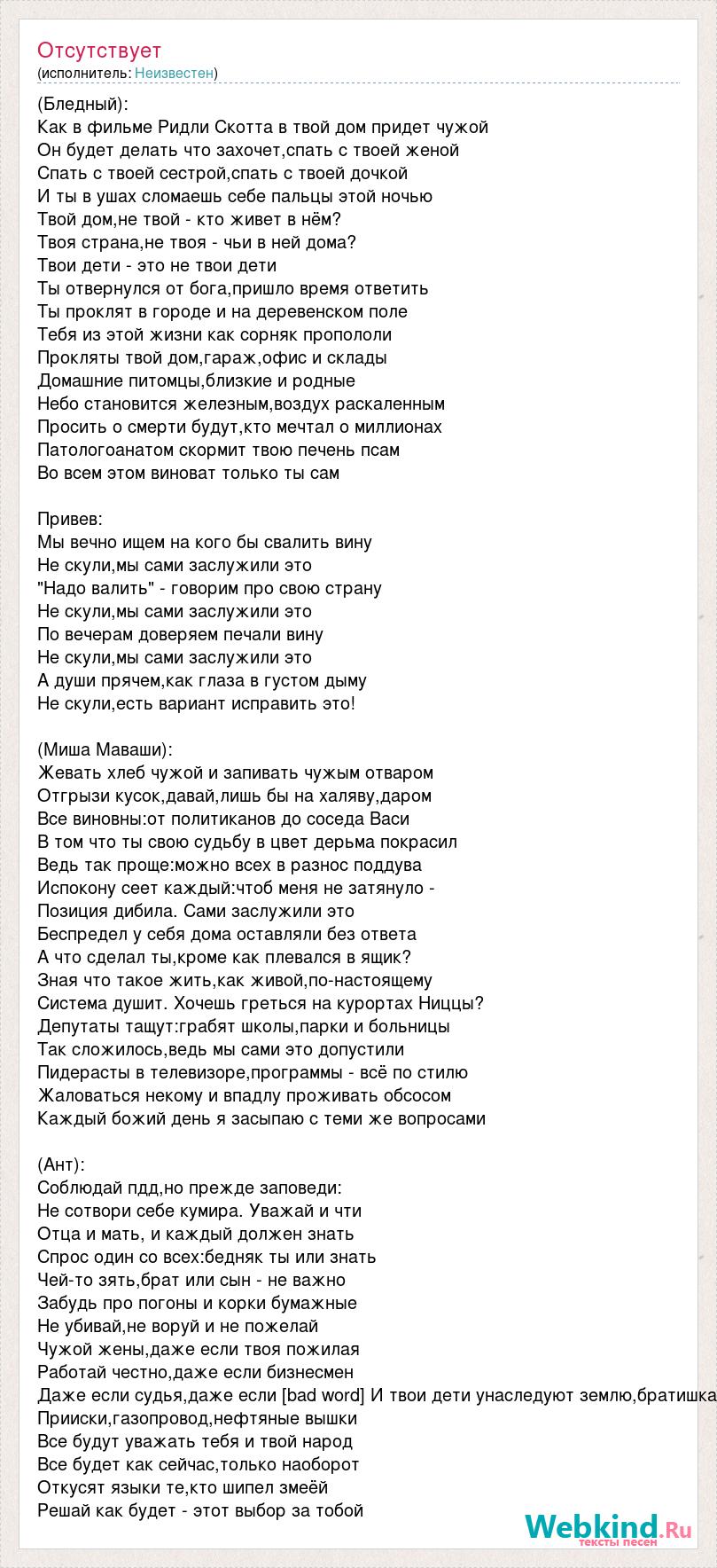 (Бледный): Как в фильме Ридли Скотта в твой дом придет чужой Он будет делать что захочет,спать с твоей женой Спать с твоей сестрой,спать с твоей дочкой И ты в ушах сломаешь себе пальцы этой ночью Твой дом,не твой - кто живет в нём? Твоя страна,не твоя - чьи в ней дома? Твои дети - это не твои дети Ты отвернулся от бога,пришло время ответить Ты проклят в городе и на деревенском поле Тебя из этой жизни как сорняк пропололи Прокляты твой дом,гараж,офис и склады Домашние питомцы,близкие и родные Небо становится железным,воздух раскаленным Просить о смерти будут,кто мечтал о миллионах Патологоанатом скормит твою печень псам Во всем этом виноват только ты сам Привев: Мы вечно ищем на кого бы свалить вину Не скули,мы сами заслужили это "Надо валить" - говорим про свою страну Не скули,мы сами заслужили это По вечерам доверяем печали вину Не скули,мы сами заслужили это А души прячем,как глаза в густом дыму Не скули,есть вариант исправить это! (Миша Маваши): Жевать хлеб чужой и запивать чужым отваром Отгрызи кусок,давай,лишь бы на халяву,даром Все виновны:от политиканов до соседа Васи В том что ты свою судьбу в цвет дерьма покрасил Ведь так проще:можно всех в разнос поддува Испокону сеет каждый:чтоб меня не затянуло - Позиция дибила. Сами заслужили это Беспредел у себя дома оставляли без ответа А что сделал ты,кроме как плевался в ящик? Зная что такое жить,как живой,по-настоящему Система душит. Хочешь греться на курортах Ниццы? Депутаты тащут:грабят школы,парки и больницы Так сложилось,ведь мы сами это допустили Пидерасты в телевизоре,программы - всё по стилю Жаловаться некому и впадлу проживать обсосом Каждый божий день я засыпаю с теми же вопросами (Ант): Соблюдай пдд,но прежде заповеди: Не сотвори себе кумира. Уважай и чти Отца и мать, и каждый должен знать Спрос один со всех:бедняк ты или знать Чей-то зять,брат или сын - не важно Забудь про погоны и корки бумажные Не убивай,не воруй и не пожелай Чужой жены,даже если твоя пожилая Работай честно,даже если бизнесмен Даже если судья,даже если [bad word] И твои дети унаследуют землю,братишка Прииски,газопровод,нефтяные вышки Все будут уважать тебя и твой народ Все будет как сейчас,только наоборот Откусят языки те,кто шипел змеёй Решай как будет - этот выбор за тобой