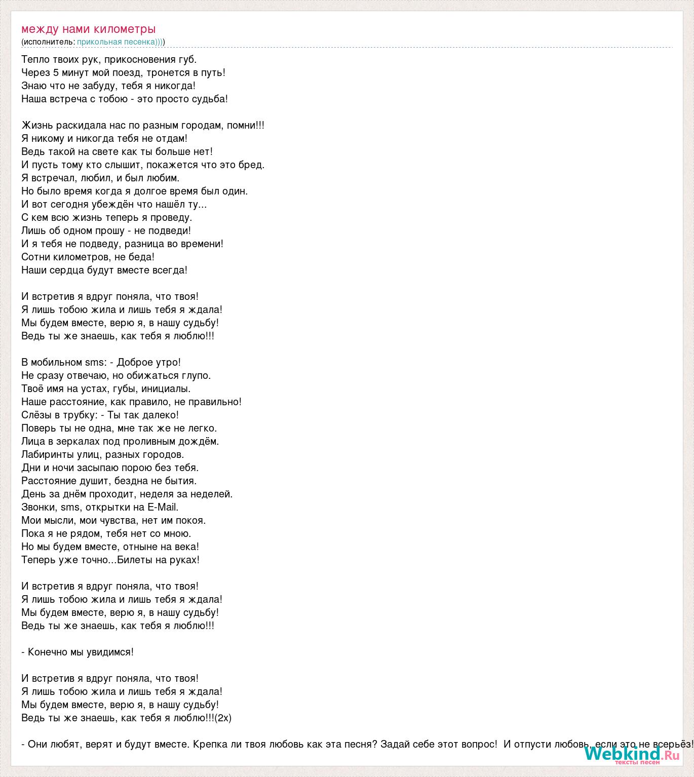 Тепло твоих рук, прикосновения губ. Через 5 минут мой поезд, тронется в путь! Знаю что не забуду, тебя я никогда! Наша встреча с тобою - это просто судьба! Жизнь раскидала нас по разным городам, помни!!! Я никому и никогда тебя не отдам! Ведь такой на свете как ты больше нет! И пусть тому кто слышит, покажется что это бред. Я встречал, любил, и был любим. Но было время когда я долгое время был один. И вот сегодня убеждён что нашёл ту... С кем всю жизнь теперь я проведу. Лишь об одном прошу - не подведи! И я тебя не подведу, разница во времени! Сотни километров, не беда! Наши сердца будут вместе всегда! И встретив я вдруг поняла, что твоя! Я лишь тобою жила и лишь тебя я ждала! Мы будем вместе, верю я, в нашу судьбу! Ведь ты же знаешь, как тебя я люблю!!! В мобильном sms: - Доброе утро! Не сразу отвечаю, но обижаться глупо. Твоё имя на устах, губы, инициалы. Наше расстояние, как правило, не правильно! Слёзы в трубку: - Ты так далеко! Поверь ты не одна, мне так же не легко. Лица в зеркалах под проливным дождём. Лабиринты улиц, разных городов. Дни и ночи засыпаю порою без тебя. Расстояние душит, бездна не бытия. День за днём проходит, неделя за неделей. Звонки, sms, открытки на E-Mail. Мои мысли, мои чувства, нет им покоя. Пока я не рядом, тебя нет со мною. Но мы будем вместе, отныне на века! Теперь уже точно...Билеты на руках! И встретив я вдруг поняла, что твоя! Я лишь тобою жила и лишь тебя я ждала! Мы будем вместе, верю я, в нашу судьбу! Ведь ты же знаешь, как тебя я люблю!!! - Конечно мы увидимся! И встретив я вдруг поняла, что твоя! Я лишь тобою жила и лишь тебя я ждала! Мы будем вместе, верю я, в нашу судьбу! Ведь ты же знаешь, как тебя я люблю!!!(2х) - Они любят, верят и будут вместе. Крепка ли твоя любовь как эта песня? Задай себе этот вопрос! И отпусти любовь, если это не всерьёз!