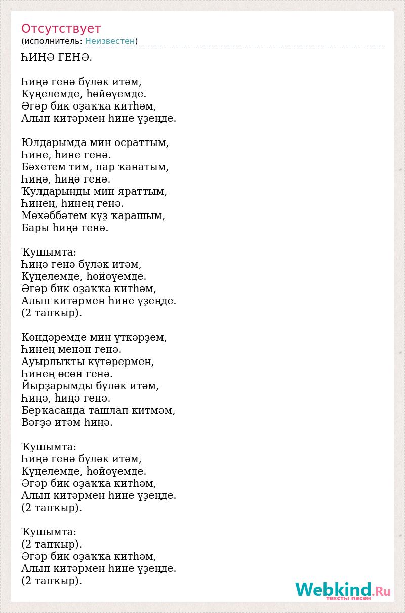 ҺИҢӘ ГЕНӘ. Һиңә генә бүләк итәм, Күңелемде, һөйөүемде. Әгәр бик оҙаҡҡа китһәм, Алып китәрмен һине үҙеңде. Юлдарымда мин осраттым, Һине, һине генә. Бәхетем тим, пар ҡанатым, Һиңә, һиңә генә. Ҡулдарыңды мин яраттым, Һинең, һинең генә. Мөхәббәтем күҙ ҡарашым, Бары һиңә генә. Ҡушымта: Һиңә генә бүләк итәм, Күңелемде, һөйөүемде. Әгәр бик оҙаҡҡа китһәм, Алып китәрмен һине үҙеңде. (2 тапҡыр). Көндәремде мин үткәрҙем, Һинең менән генә. Ауырлыҡты күтәрермен, Һинең өсөн генә. Йырҙарымды бүләк итәм, Һиңә, һиңә генә. Берҡасанда ташлап китмәм, Вәғҙә итәм һиңә. Ҡушымта: Һиңә генә бүләк итәм, Күңелемде, һөйөүемде. Әгәр бик оҙаҡҡа китһәм, Алып китәрмен һине үҙеңде. (2 тапҡыр). Ҡушымта: (2 тапҡыр). Әгәр бик оҙаҡҡа китһәм, Алып китәрмен һине үҙеңде. (2 тапҡыр).