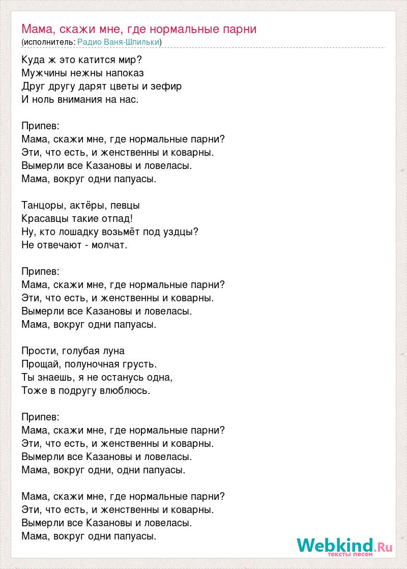 Куда ж это катится мир? Мужчины нежны напоказ Друг другу дарят цветы и зефир И ноль внимания на нас. Припев: Мама, скажи мне, где нормальные парни? Эти, что есть, и женственны и коварны. Вымерли все Казановы и ловеласы. Мама, вокруг одни папуасы. Танцоры, актёры, певцы Красавцы такие отпад! Ну, кто лошадку возьмёт под уздцы? Не отвечают - молчат. Припев: Мама, скажи мне, где нормальные парни? Эти, что есть, и женственны и коварны. Вымерли все Казановы и ловеласы. Мама, вокруг одни папуасы. Прости, голубая луна Прощай, полуночная грусть. Ты знаешь, я не останусь одна, Тоже в подругу влюблюсь. Припев: Мама, скажи мне, где нормальные парни? Эти, что есть, и женственны и коварны. Вымерли все Казановы и ловеласы. Мама, вокруг одни, одни папуасы. Мама, скажи мне, где нормальные парни? Эти, что есть, и женственны и коварны. Вымерли все Казановы и ловеласы. Мама, вокруг одни папуасы.