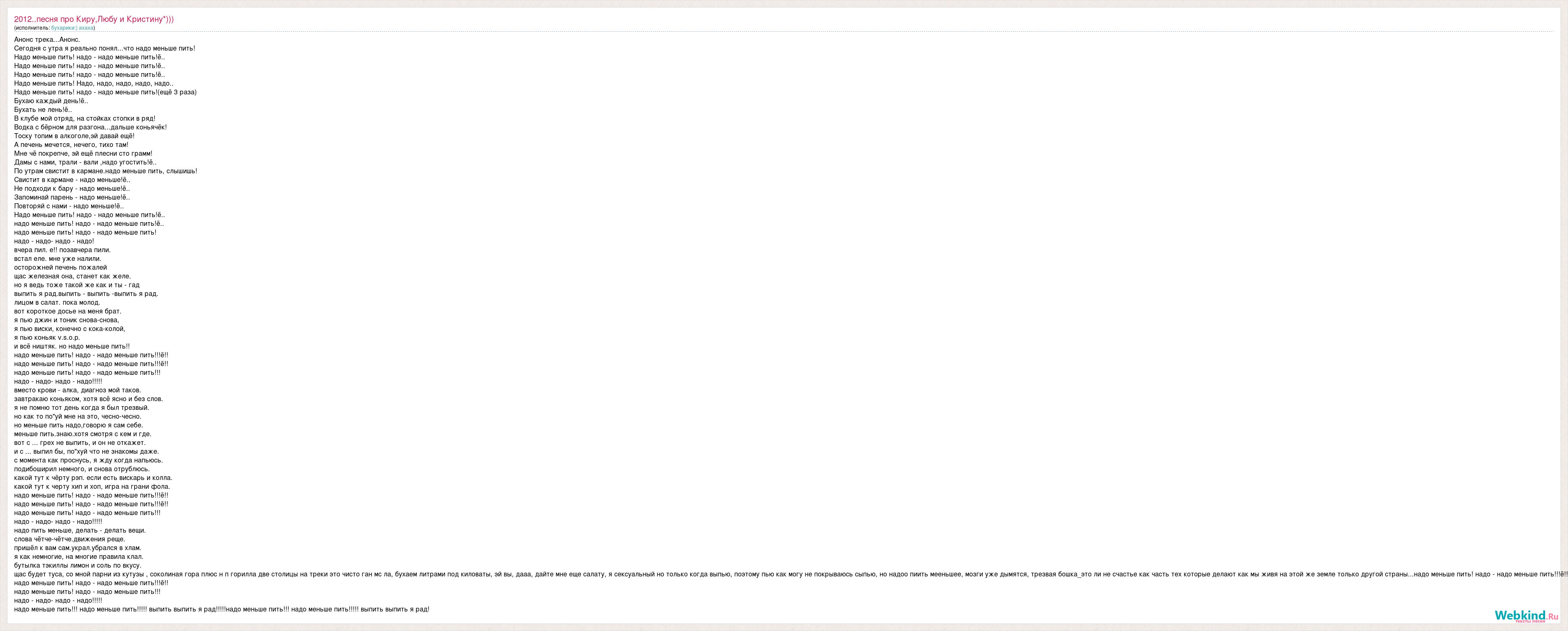 Анонс трека...Анонс. Cегодня с утра я реально понял...что надо меньше пить! Надо меньше пить! надо - надо меньше пить!ё.. Надо меньше пить! надо - надо меньше пить!ё.. Надо меньше пить! надо - надо меньше пить!ё.. Надо меньше пить! Надо, надо, надо, надо, надо.. Надо меньше пить! надо - надо меньше пить!(ещё 3 раза) Бухаю каждый день!ё.. Бухать не лень!ё.. В клубе мой отряд, на стойках стопки в ряд! Водка с бёрном для разгона...дальше коньячёк! Тоску топим в алкоголе,эй давай ещё! А печень мечется, нечего, тихо там! Мне чё покрепче, эй ещё плесни сто грамм! Дамы с нами, трали - вали ,надо угостить!ё.. По утрам свистит в кармане.надо меньше пить, слышишь! Свистит в кармане - надо меньше!ё.. Не подходи к бару - надо меньше!ё.. Запоминай парень - надо меньше!ё.. Повторяй с нами - надо меньше!ё.. Надо меньше пить! надо - надо меньше пить!ё.. надо меньше пить! надо - надо меньше пить!ё.. надо меньше пить! надо - надо меньше пить! надо - надо- надо - надо! вчера пил. е!! позавчера пили. встал еле. мне уже налили. осторожней печень пожалей щас железная она, станет как желе. но я ведь тоже такой же как и ты - гад выпить я рад.выпить - выпить -выпить я рад. лицом в салат. пока молод. вот короткое досье на меня брат. я пью джин и тоник снова-снова, я пью виски, конечно с кока-колой, я пью коньяк v.s.o.p. и всё ништяк. но надо меньше пить!! надо меньше пить! надо - надо меньше пить!!!ё!! надо меньше пить! надо - надо меньше пить!!!ё!! надо меньше пить! надо - надо меньше пить!!! надо - надо- надо - надо!!!!! вместо крови - алка, диагноз мой таков. завтракаю коньяком, хотя всё ясно и без слов. я не помню тот день когда я был трезвый. но как то по"уй мне на это, чесно-чесно. но меньше пить надо,говорю я сам себе. меньше пить.знаю.хотя смотря с кем и где. вот с ... грех не выпить, и он не откажет. и с ... выпил бы, по"хуй что не знакомы даже. с момента как проснусь, я жду когда напьюсь. подибоширил немного, и снова отрублюсь. какой тут к чёрту рэп. если есть вискарь и колла. какой тут к черту хип и хоп, игра на грани фола. надо меньше пить! надо - надо меньше пить!!!ё!! надо меньше пить! надо - надо меньше пить!!!ё!! надо меньше пить! надо - надо меньше пить!!! надо - надо- надо - надо!!!!! надо пить меньше, делать - делать вещи. слова чётче-чётче.движения реще. пришёл к вам сам.украл.убрался в хлам. я как немногие, на многие правила клал. бутылка тэкиллы лимон и соль по вкусу. щас будет туса, со мной парни из кутузы , соколиная гора плюс н п горилла две столицы на треки это чисто ган мс ла, бухаем литрами под киловаты, эй вы, дааа, дайте мне еще салату, я сексуальный но только когда выпью, поэтому пью как могу не покрываюсь сыпью, но надоо пиить мееньшее, мозги уже дымятся, трезвая бошка_это ли не счастье как часть тех которые делают как мы живя на этой же земле только другой страны...надо меньше пить! надо - надо меньше пить!!!ё!! надо меньше пить! надо - надо меньше пить!!!ё!! надо меньше пить! надо - надо меньше пить!!! надо - надо- надо - надо!!!!! надо меньше пить!!! надо меньше пить!!!!! выпить выпить я рад!!!!!надо меньше пить!!! надо меньше пить!!!!! выпить выпить я рад!