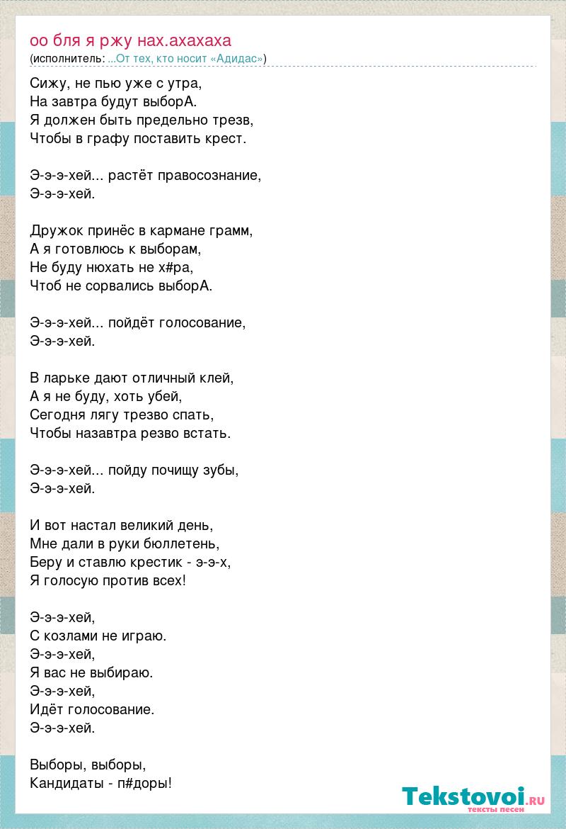 Сижу, не пью уже с утра, На завтра будут выборА. Я должен быть предельно трезв, Чтобы в графу поставить крест. Э-э-э-хей... растёт правосознание, Э-э-э-хей. Дружок принёс в кармане грамм, А я готовлюсь к выборам, Не буду нюхать не х#ра, Чтоб не сорвались выборА. Э-э-э-хей... пойдёт голосование, Э-э-э-хей. В ларьке дают отличный клей, А я не буду, хоть убей, Сегодня лягу трезво спать, Чтобы назавтра резво встать. Э-э-э-хей... пойду почищу зубы, Э-э-э-хей. И вот настал великий день, Мне дали в руки бюллетень, Беру и ставлю крестик - э-э-х, Я голосую против всех! Э-э-э-хей, С козлами не играю. Э-э-э-хей, Я вас не выбираю. Э-э-э-хей, Идёт голосование. Э-э-э-хей. Выборы, выборы, Кандидаты - п#доры!
