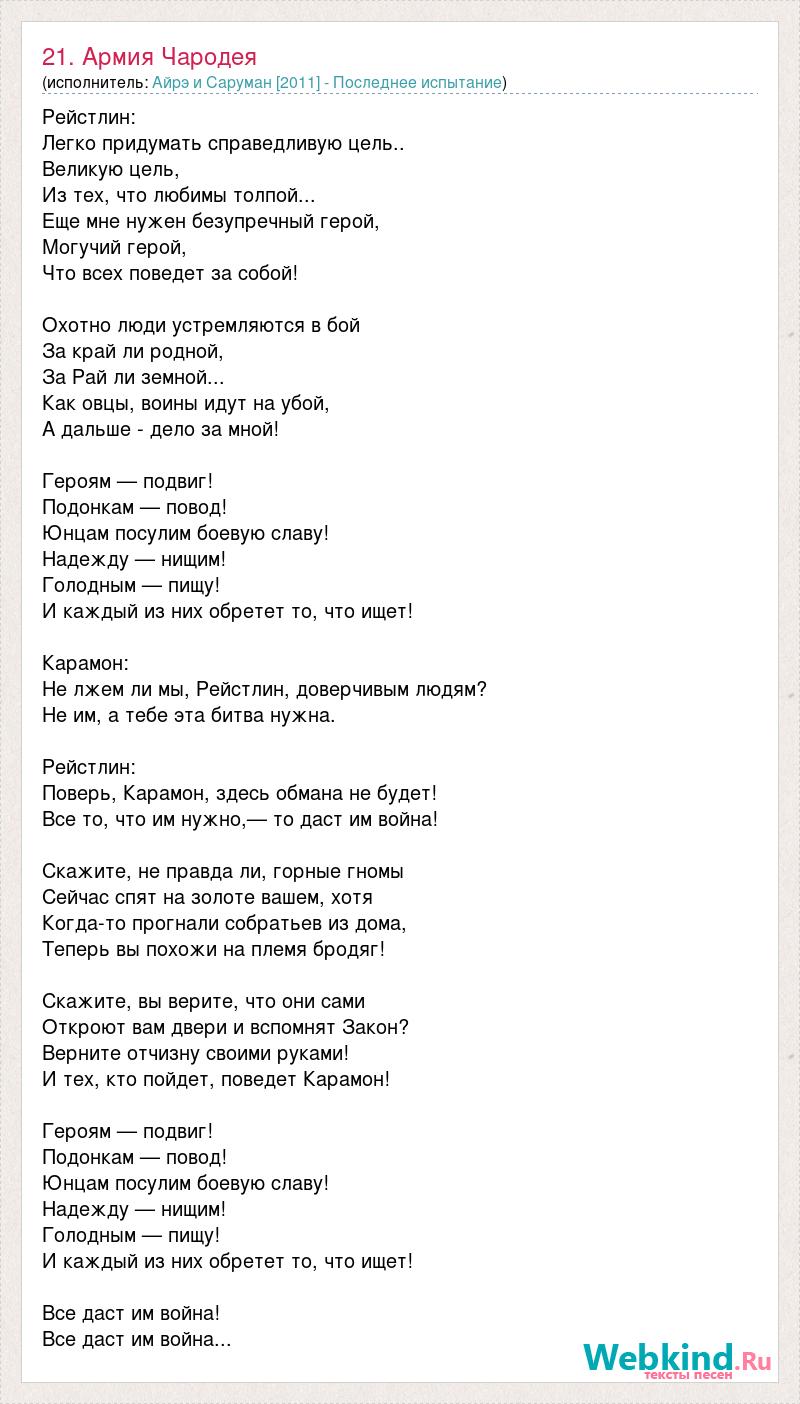 Рейстлин: Легко придумать справедливую цель.. Великую цель, Из тех, что любимы толпой... Еще мне нужен безупречный герой, Могучий герой, Что всех поведет за собой! Охотно люди устремляются в бой За край ли родной, За Рай ли земной... Как овцы, воины идут на убой, А дальше - дело за мной! Героям — подвиг! Подонкам — повод! Юнцам посулим боевую славу! Надежду — нищим! Голодным — пищу! И каждый из них обретет то, что ищет! Карамон: Не лжем ли мы, Рейстлин, доверчивым людям? Не им, а тебе эта битва нужна. Рейстлин: Поверь, Карамон, здесь обмана не будет! Все то, что им нужно,— то даст им война! Скажите, не правда ли, горные гномы Сейчас спят на золоте вашем, хотя Когда-то прогнали собратьев из дома, Теперь вы похожи на племя бродяг! Скажите, вы верите, что они сами Откроют вам двери и вспомнят Закон? Верните отчизну своими руками! И тех, кто пойдет, поведет Карамон! Героям — подвиг! Подонкам — повод! Юнцам посулим боевую славу! Надежду — нищим! Голодным — пищу! И каждый из них обретет то, что ищет! Все даст им война! Все даст им война...