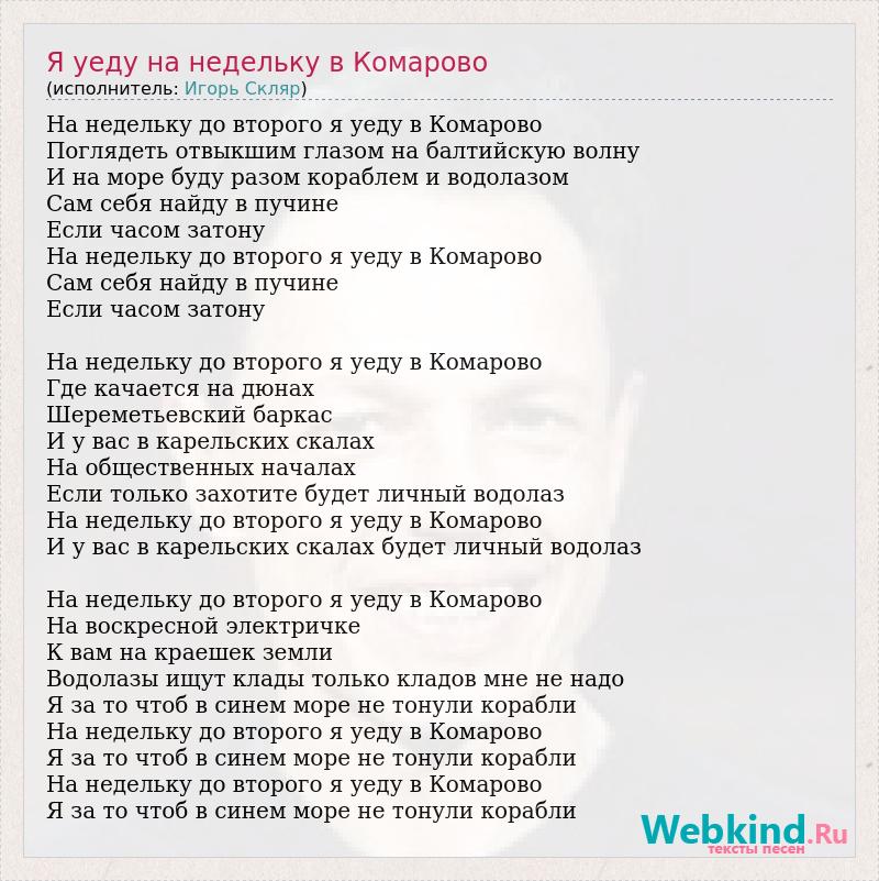 На недельку до второго я уеду в Комарово Поглядеть отвыкшим глазом на балтийскую волну И на море буду разом кораблем и водолазом Сам себя найду в пучине Если часом затону На недельку до второго я уеду в Комарово Сам себя найду в пучине Если часом затону На недельку до второго я уеду в Комарово Где качается на дюнах Шереметьевский баркас И у вас в карельских скалах На общественных началах Если только захотите будет личный водолаз На недельку до второго я уеду в Комарово И у вас в карельских скалах будет личный водолаз На недельку до второго я уеду в Комарово На воскресной электричке К вам на краешек земли Водолазы ищут клады только кладов мне не надо Я за то чтоб в синем море не тонули корабли На недельку до второго я уеду в Комарово Я за то чтоб в синем море не тонули корабли На недельку до второго я уеду в Комарово Я за то чтоб в синем море не тонули корабли