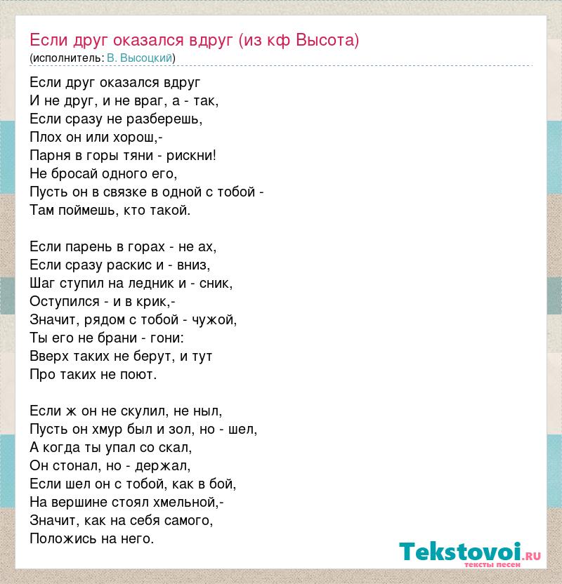 Если друг оказался вдруг И не друг, и не враг, а - так, Если сразу не разберешь, Плох он или хорош,- Парня в горы тяни - рискни! Не бросай одного его, Пусть он в связке в одной с тобой - Там поймешь, кто такой. Если парень в горах - не ах, Если сразу раскис и - вниз, Шаг ступил на ледник и - сник, Оступился - и в крик,- Значит, рядом с тобой - чужой, Ты его не брани - гони: Вверх таких не берут, и тут Про таких не поют. Если ж он не скулил, не ныл, Пусть он хмур был и зол, но - шел, А когда ты упал со скал, Он стонал, но - держал, Если шел он с тобой, как в бой, На вершине стоял хмельной,- Значит, как на себя самого, Положись на него.