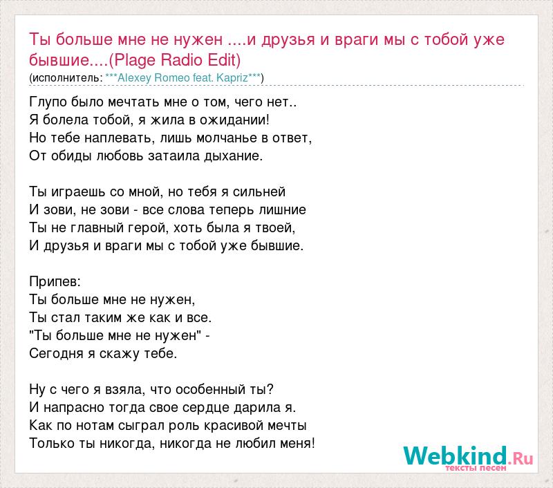 Главная→Исполнители→***Alexey Romeo feat. Kapriz***→Ты больше мне не нужен ....и друзья и враги мы с тобой уже бывшие....(Plag