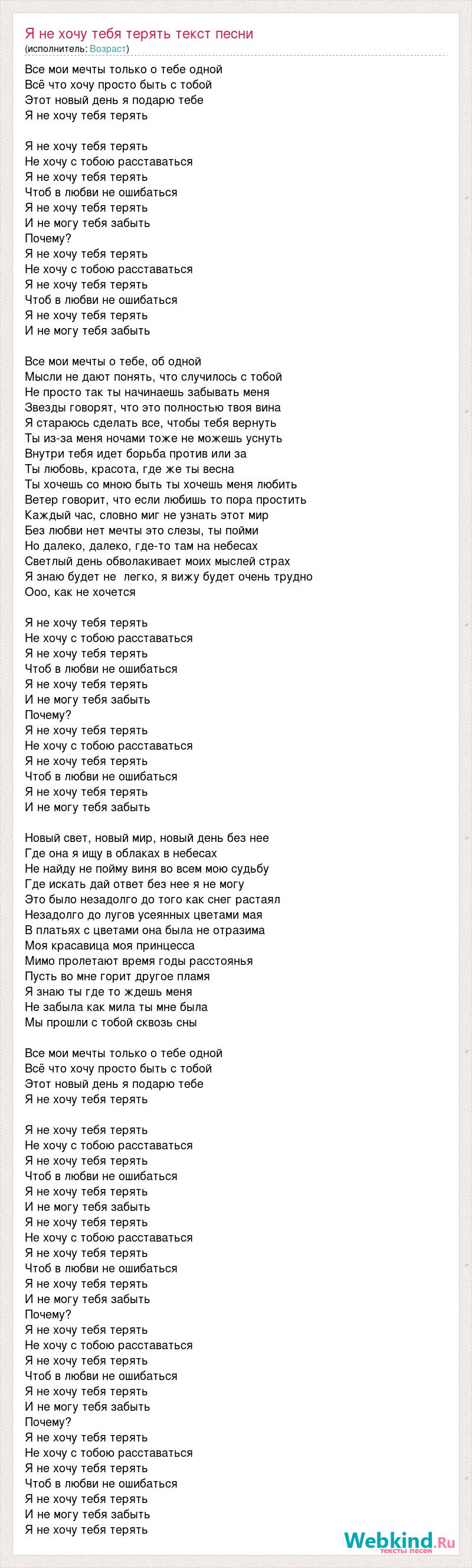 Все мои мечты только о тебе одной Всё что хочу просто быть с тобой Этот новый день я подарю тебе Я не хочу тебя терять Я не хочу тебя терять Не хочу с тобою расставаться Я не хочу тебя терять Чтоб в любви не ошибаться Я не хочу тебя терять И не могу тебя забыть Почему? Я не хочу тебя терять Не хочу с тобою расставаться Я не хочу тебя терять Чтоб в любви не ошибаться Я не хочу тебя терять И не могу тебя забыть Все мои мечты о тебе, об одной Мысли не дают понять, что случилось с тобой Не просто так ты начинаешь забывать меня Звезды говорят, что это полностью твоя вина Я стараюсь сделать все, чтобы тебя вернуть Ты из-за меня ночами тоже не можешь уснуть Внутри тебя идет борьба против или за Ты любовь, красота, где же ты весна Ты хочешь со мною быть ты хочешь меня любить Ветер говорит, что если любишь то пора простить Каждый час, словно миг не узнать этот мир Без любви нет мечты это слезы, ты пойми Но далеко, далеко, где-то там на небесах Светлый день обволакивает моих мыслей страх Я знаю будет не легко, я вижу будет очень трудно Ооо, как не хочется Я не хочу тебя терять Не хочу с тобою расставаться Я не хочу тебя терять Чтоб в любви не ошибаться Я не хочу тебя терять И не могу тебя забыть Почему? Я не хочу тебя терять Не хочу с тобою расставаться Я не хочу тебя терять Чтоб в любви не ошибаться Я не хочу тебя терять И не могу тебя забыть Новый свет, новый мир, новый день без нее Где она я ищу в облаках в небесах Не найду не пойму виня во всем мою судьбу Где искать дай ответ без нее я не могу Это было незадолго до того как снег растаял Незадолго до лугов усеянных цветами мая В платьях с цветами она была не отразима Моя красавица моя принцесса Мимо пролетают время годы расстоянья Пусть во мне горит другое пламя Я знаю ты где то ждешь меня Не забыла как мила ты мне была Мы прошли с тобой сквозь сны Все мои мечты только о тебе одной Всё что хочу просто быть с тобой Этот новый день я подарю тебе Я не хочу тебя терять Я не хочу тебя терять Не хочу с тобою расставаться Я не хочу тебя терять Чтоб в любви не ошибаться Я не хочу тебя терять И не могу тебя забыть Я не хочу тебя терять Не хочу с тобою расставаться Я не хочу тебя терять Чтоб в любви не ошибаться Я не хочу тебя терять И не могу тебя забыть Почему? Я не хочу тебя терять Не хочу с тобою расставаться Я не хочу тебя терять Чтоб в любви не ошибаться Я не хочу тебя терять И не могу тебя забыть Почему? Я не хочу тебя терять Не хочу с тобою расставаться Я не хочу тебя терять Чтоб в любви не ошибаться Я не хочу тебя терять И не могу тебя забыть Я не хочу тебя терять