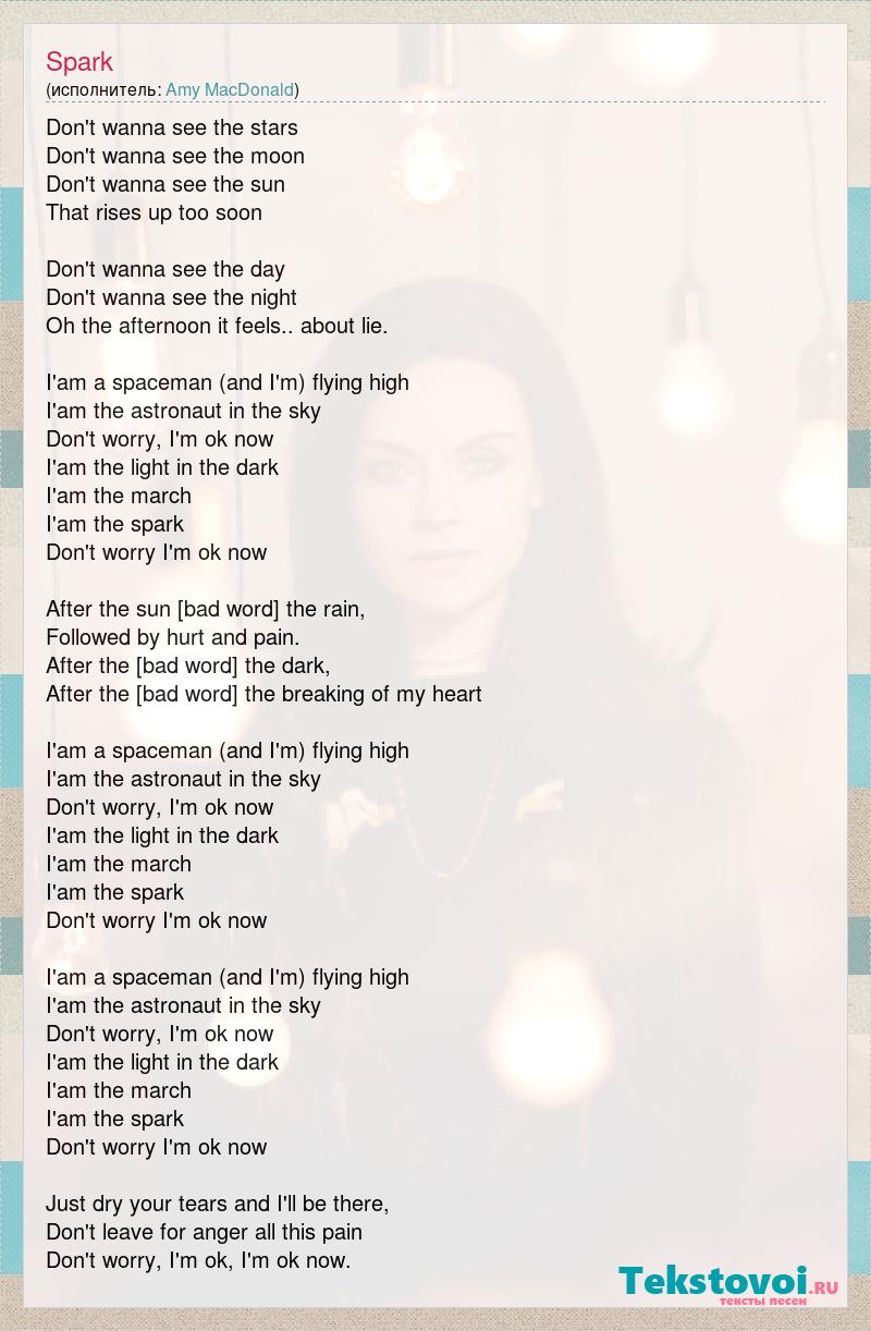 Don't wanna see the stars Don't wanna see the moon Don't wanna see the sun That rises up too soon Don't wanna see the day Don't wanna see the night Oh the afternoon it feels.. about lie. I'am a spaceman (and I'm) flying high I'am the astronaut in the sky Don't worry, I'm ok now I'am the light in the dark I'am the march I'am the spark Don't worry I'm ok now After the sun always comes the rain, Followed by hurt and pain. After the light comes the dark, After the love comes the breaking of my heart I'am a spaceman (and I'm) flying high I'am the astronaut in the sky Don't worry, I'm ok now I'am the light in the dark I'am the march I'am the spark Don't worry I'm ok now I'am a spaceman (and I'm) flying high I'am the astronaut in the sky Don't worry, I'm ok now I'am the light in the dark I'am the march I'am the spark Don't worry I'm ok now Just dry your tears and I'll be there, Don't leave for anger all this pain Don't worry, I'm ok, I'm ok now.