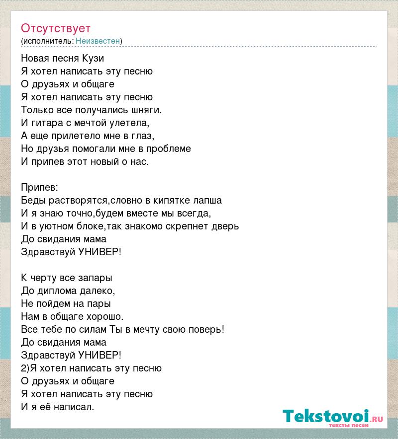 Новая песня Кузи Я хотел написать эту песню О друзьях и общаге Я хотел написать эту песню Только все получались шняги. И гитара с мечтой улетела, А еще прилетело мне в глаз, Но друзья помогали мне в проблеме И припев этот новый о нас. Припев: Беды растворятся,словно в кипятке лапша И я знаю точно,будем вместе мы всегда, И в уютном блоке,так знакомо скрепнет дверь До свидания мама Здравствуй УНИВЕР! К черту все запары До диплома далеко, Не пойдем на пары Нам в общаге хорошо. Все тебе по силам Ты в мечту свою поверь! До свидания мама Здравствуй УНИВЕР! 2)Я хотел написать эту песню О друзьях и общаге Я хотел написать эту песню И я её написал.