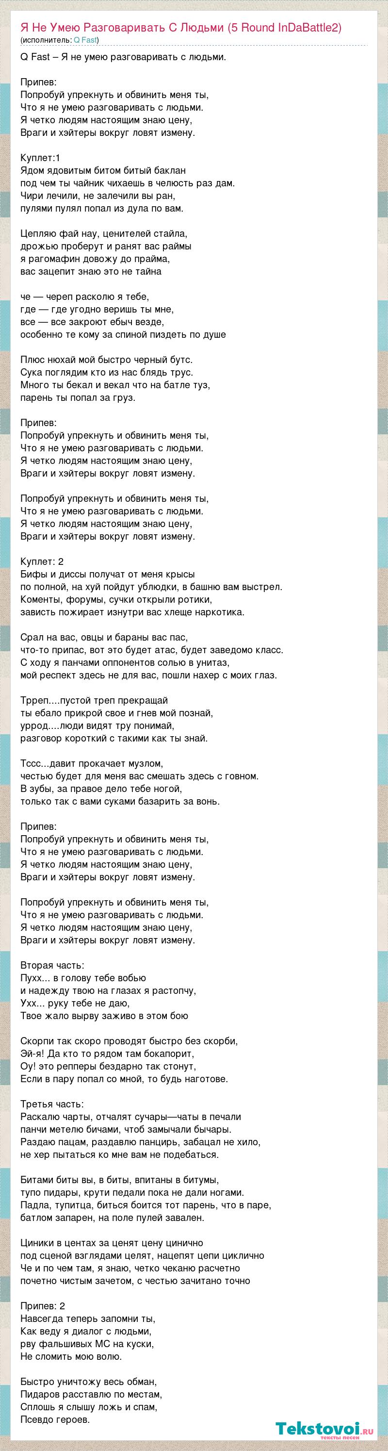 Q Fast – Я не умею разговаривать с людьми. Припев: Попробуй упрекнуть и обвинить меня ты, Что я не умею разговаривать с людьми. Я четко людям настоящим знаю цену, Враги и хэйтеры вокруг ловят измену. Куплет:1 Ядом ядовитым битом битый баклан под чем ты чайник чихаешь в челюсть раз дам. Чири лечили, не залечили вы ран, пулями пулял попал из дула по вам. Цепляю фай нау, ценителей стайла, дрожью проберут и ранят вас раймы я рагомафин довожу до прайма, вас зацепит знаю это не тайна че — череп расколю я тебе, где — где угодно веришь ты мне, все — все закроют ебыч везде, особенно те кому за спиной пиздеть по душе Плюс нюхай мой быстро черный бутс. Сука поглядим кто из нас блядь трус. Много ты бекал и векал что на батле туз, парень ты попал за груз. Припев: Попробуй упрекнуть и обвинить меня ты, Что я не умею разговаривать с людьми. Я четко людям настоящим знаю цену, Враги и хэйтеры вокруг ловят измену. Попробуй упрекнуть и обвинить меня ты, Что я не умею разговаривать с людьми. Я четко людям настоящим знаю цену, Враги и хэйтеры вокруг ловят измену. Куплет: 2 Бифы и диссы получат от меня крысы по полной, на хуй пойдут ублюдки, в башню вам выстрел. Коменты, форумы, сучки открыли ротики, зависть пожирает изнутри вас хлеще наркотика. Срал на вас, овцы и бараны вас пас, что-то припас, вот это будет атас, будет заведомо класс. С ходу я панчами оппонентов солью в унитаз, мой респект здесь не для вас, пошли нахер с моих глаз. Трреп....пустой треп прекращай ты ебало прикрой свое и гнев мой познай, уррод....люди видят тру понимай, разговор короткий с такими как ты знай. Тссс...давит прокачает музлом, честью будет для меня вас смешать здесь с говном. В зубы, за правое дело тебе ногой, только так с вами суками базарить за вонь. Припев: Попробуй упрекнуть и обвинить меня ты, Что я не умею разговаривать с людьми. Я четко людям настоящим знаю цену, Враги и хэйтеры вокруг ловят измену. Попробуй упрекнуть и обвинить меня ты, Что я не умею разговаривать с людьми. Я четко людям настоящим знаю цену, Враги и хэйтеры вокруг ловят измену. Вторая часть: Пухх... в голову тебе вобью и надежду твою на глазах я растопчу, Ухх... руку тебе не даю, Твое жало вырву заживо в этом бою Скорпи так скоро проводят быстро без скорби, Эй-я! Да кто то рядом там бокапорит, Оу! это репперы бездарно так стонут, Если в пару попал со мной, то будь наготове. Третья часть: Раскалю чарты, отчалят сучары—чаты в печали панчи метелю бичами, чтоб замычали бычары. Раздаю пацам, раздавлю панцирь, забацал не хило, не хер пытаться ко мне вам не подебаться. Битами биты вы, в биты, впитаны в битумы, тупо пидары, крути педали пока не дали ногами. Падла, тупитца, биться боится тот парень, что в паре, батлом запарен, на поле пулей завален. Циники в центах за ценят цену цинично под сценой взглядами целят, нацепят цепи циклично Че и по чем там, я знаю, четко чеканю расчетно почетно чистым зачетом, с честью зачитано точно Припев: 2 Навсегда теперь запомни ты, Как веду я диалог с людьми, рву фальшивых МС на куски, Не сломить мою волю. Быстро уничтожу весь обман, Пидаров расставлю по местам, Сплошь я слышу ложь и спам, Псевдо героев.