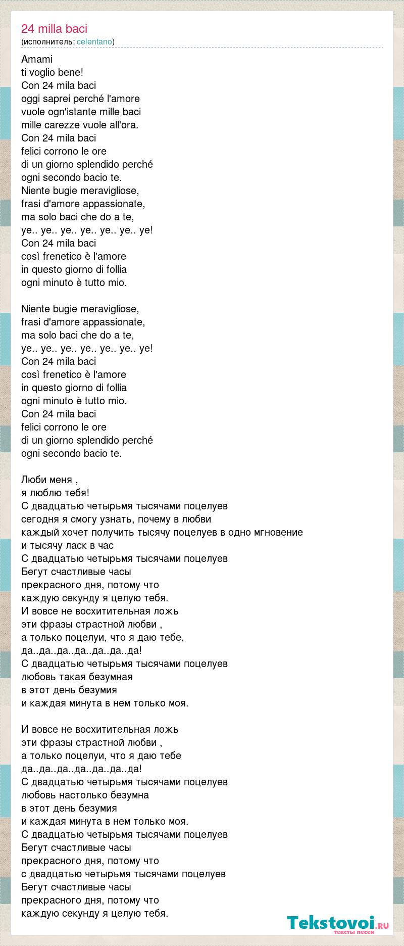 Amami ti voglio bene! Con 24 mila baci oggi saprei perché l'amore vuole ogn'istante mille baci mille carezze vuole all'ora. Con 24 mila baci felici corrono le ore di un giorno splendido perché ogni secondo bacio te. Niente bugie meravigliose, frasi d'amore appassionate, ma solo baci che do a te, ye.. ye.. ye.. ye.. ye.. ye.. ye! Con 24 mila baci così frenetico è l'amore in questo giorno di follia ogni minuto è tutto mio. Niente bugie meravigliose, frasi d'amore appassionate, ma solo baci che do a te, ye.. ye.. ye.. ye.. ye.. ye.. ye! Con 24 mila baci così frenetico è l'amore in questo giorno di follia ogni minuto è tutto mio. Con 24 mila baci felici corrono le ore di un giorno splendido perché ogni secondo bacio te. Люби меня , я люблю тебя! С двадцатью четырьмя тысячами поцелуев сегодня я смогу узнать, почему в любви каждый хочет получить тысячу поцелуев в одно мгновение и тысячу ласк в час С двадцатью четырьмя тысячами поцелуев Бегут счастливые часы прекрасного дня, потому что каждую секунду я целую тебя. И вовсе не восхитительная ложь эти фразы страстной любви , а только поцелуи, что я даю тебе, да..да..да..да..да..да..да! С двадцатью четырьмя тысячами поцелуев любовь такая безумная в этот день безумия и каждая минута в нем только моя. И вовсе не восхитительная ложь эти фразы страстной любви , а только поцелуи, что я даю тебе да..да..да..да..да..да..да! С двадцатью четырьмя тысячами поцелуев любовь настолько безумна в этот день безумия и каждая минута в нем только моя. С двадцатью четырьмя тысячами поцелуев Бегут счастливые часы прекрасного дня, потому что с двадцатью четырьмя тысячами поцелуев Бегут счастливые часы прекрасного дня, потому что каждую секунду я целую тебя.