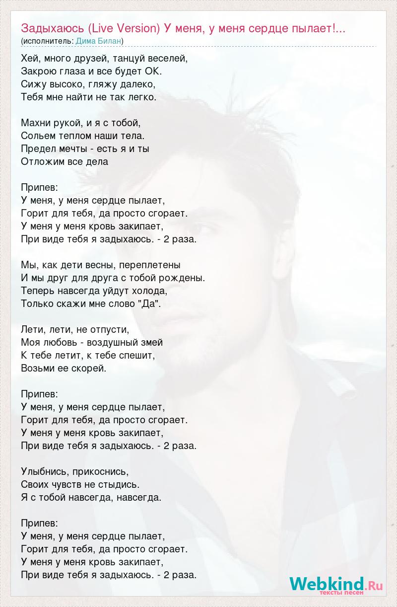 Хей, много друзей, танцуй веселей, Закрою глаза и все будет ОК. Сижу высоко, гляжу далеко, Тебя мне найти не так легко. Махни рукой, и я с тобой, Сольем теплом наши тела. Предел мечты - есть я и ты Отложим все дела Припев: У меня, у меня сердце пылает, Горит для тебя, да просто сгорает. У меня у меня кровь закипает, При виде тебя я задыхаюсь. - 2 раза. Мы, как дети весны, переплетены И мы друг для друга с тобой рождены. Теперь навсегда уйдут холода, Только скажи мне слово "Да". Лети, лети, не отпусти, Моя любовь - воздушный змей К тебе летит, к тебе спешит, Возьми ее скорей. Припев: У меня, у меня сердце пылает, Горит для тебя, да просто сгорает. У меня у меня кровь закипает, При виде тебя я задыхаюсь. - 2 раза. Улыбнись, прикоснись, Своих чувств не стыдись. Я с тобой навсегда, навсегда. Припев: У меня, у меня сердце пылает, Горит для тебя, да просто сгорает. У меня у меня кровь закипает, При виде тебя я задыхаюсь. - 2 раза.