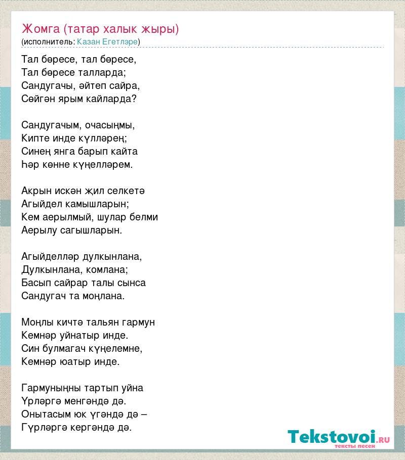 Тал бөресе, тал бөресе, Тал бөресе талларда; Сандугачы, әйтеп сайра, Сөйгән ярым кайларда? Сандугачым, очасыңмы, Кипте инде күлләрең; Синең янга барып кайта Һәр көнне күңелләрем. Акрын искән җил селкетә Агыйдел камышларын; Кем аерылмый, шулар белми Аерылу сагышларын. Агыйделләр дулкынлана, Дулкынлана, комлана; Басып сайрар талы сынса Сандугач та моңлана. Моңлы кичтә тальян гармун Кемнәр уйнатыр инде. Син булмагач күңелемне, Кемнәр юатыр инде. Гармуныңны тартып уйна Үрләргә менгәндә дә. Онытасым юк үгәндә дә – Гүрләргә кергәндә дә.