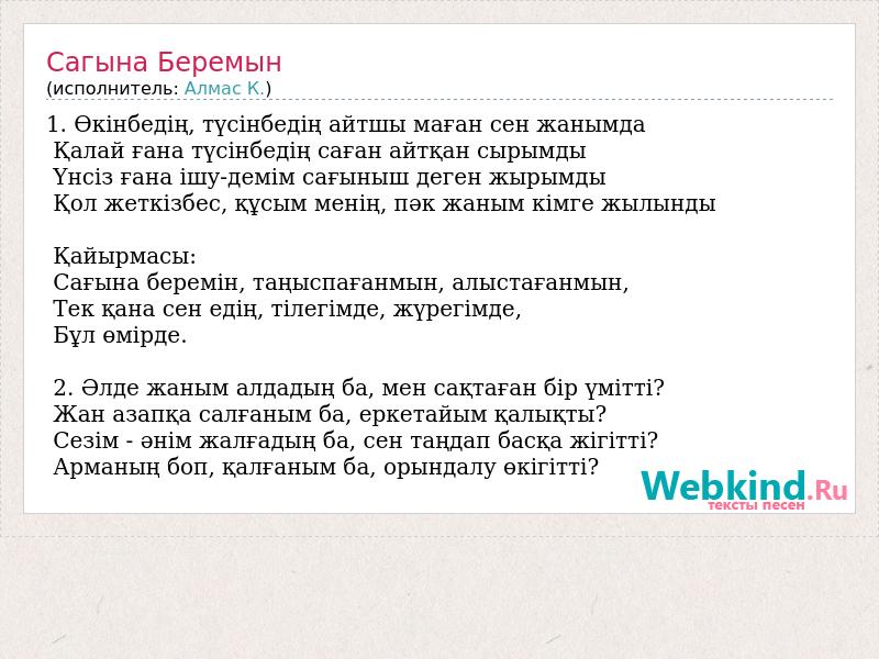 1. Өкінбедің, түсінбедің айтшы маған сен жанымда Қалай ғана түсінбедің саған айтқан сырымды Үнсіз ғана ішу-демім сағыныш деген жырымды Қол жеткізбес, құсым менің, пәк жаным кімге жылынды Қайырмасы: Сағына беремін, таңыспағанмын, алыстағанмын, Тек қана сен едің, тілегімде, жүрегімде, Бұл өмірде. 2. Әлде жаным алдадың ба, мен сақтаған бір үмітті? Жан азапқа салғаным ба, еркетайым қалықты? Сезім - әнім жалғадың ба, сен таңдап басқа жігітті? Арманың боп, қалғаным ба, орындалу өкігітті?