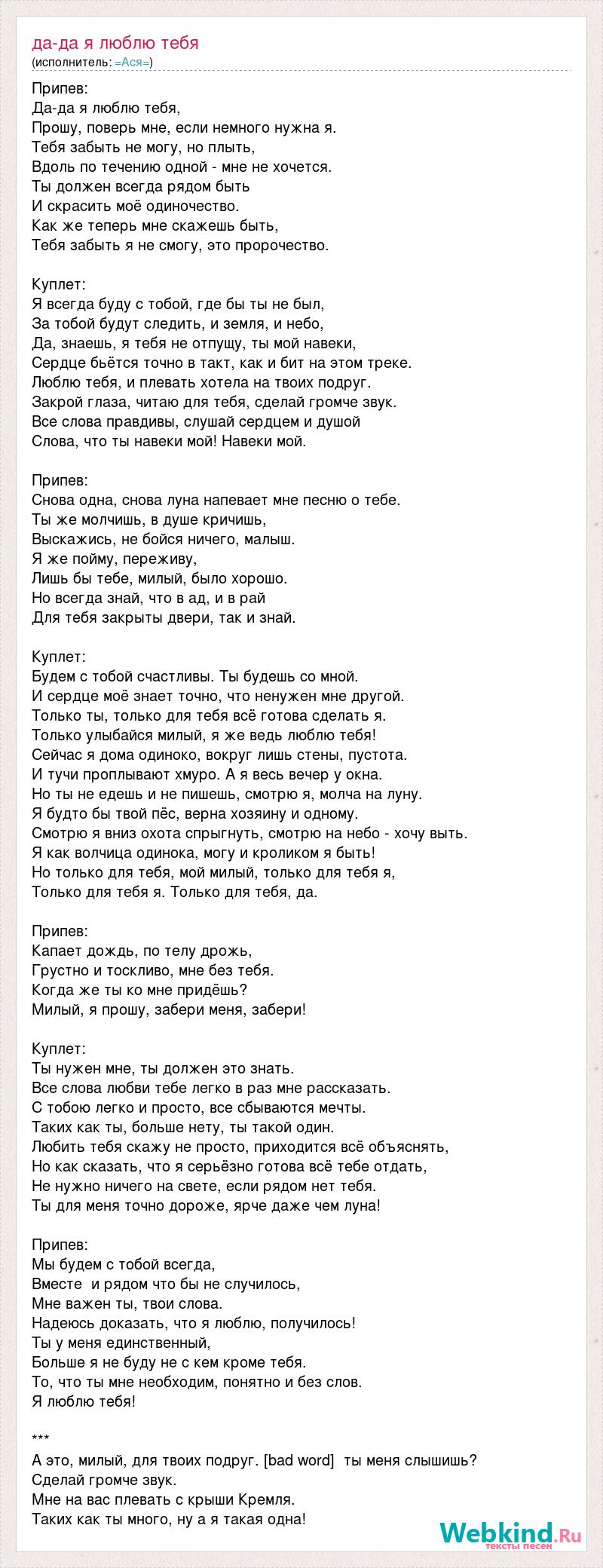 Припев: Да-да я люблю тебя, Прошу, поверь мне, если немного нужна я. Тебя забыть не могу, но плыть, Вдоль по течению одной - мне не хочется. Ты должен всегда рядом быть И скрасить моё одиночество. Как же теперь мне скажешь быть, Тебя забыть я не смогу, это пророчество. Куплет: Я всегда буду с тобой, где бы ты не был, За тобой будут следить, и земля, и небо, Да, знаешь, я тебя не отпущу, ты мой навеки, Сердце бьётся точно в такт, как и бит на этом треке. Люблю тебя, и плевать хотела на твоих подруг. Закрой глаза, читаю для тебя, сделай громче звук. Все слова правдивы, слушай сердцем и душой Слова, что ты навеки мой! Навеки мой. Припев: Снова одна, снова луна напевает мне песню о тебе. Ты же молчишь, в душе кричишь, Выскажись, не бойся ничего, малыш. Я же пойму, переживу, Лишь бы тебе, милый, было хорошо. Но всегда знай, что в ад, и в рай Для тебя закрыты двери, так и знай. Куплет: Будем с тобой счастливы. Ты будешь со мной. И сердце моё знает точно, что ненужен мне другой. Только ты, только для тебя всё готова сделать я. Только улыбайся милый, я же ведь люблю тебя! Сейчас я дома одиноко, вокруг лишь стены, пустота. И тучи проплывают хмуро. А я весь вечер у окна. Но ты не едешь и не пишешь, смотрю я, молча на луну. Я будто бы твой пёс, верна хозяину и одному. Смотрю я вниз охота спрыгнуть, смотрю на небо - хочу выть. Я как волчица одинока, могу и кроликом я быть! Но только для тебя, мой милый, только для тебя я, Только для тебя я. Только для тебя, да. Припев: Капает дождь, по телу дрожь, Грустно и тоскливо, мне без тебя. Когда же ты ко мне придёшь? Милый, я прошу, забери меня, забери! Куплет: Ты нужен мне, ты должен это знать. Все слова любви тебе легко в раз мне рассказать. С тобою легко и просто, все сбываются мечты. Таких как ты, больше нету, ты такой один. Любить тебя скажу не просто, приходится всё объяснять, Но как сказать, что я серьёзно готова всё тебе отдать, Не нужно ничего на свете, если рядом нет тебя. Ты для меня точно дороже, ярче даже чем луна! Припев: Мы будем с тобой всегда, Вместе и рядом что бы не случилось, Мне важен ты, твои слова. Надеюсь доказать, что я люблю, получилось! Ты у меня единственный, Больше я не буду не с кем кроме тебя. То, что ты мне необходим, понятно и без слов. Я люблю тебя! *** А это, милый, для твоих подруг. [bad word] ты меня слышишь? Сделай громче звук. Мне на вас плевать с крыши Кремля. Таких как ты много, ну а я такая одна!