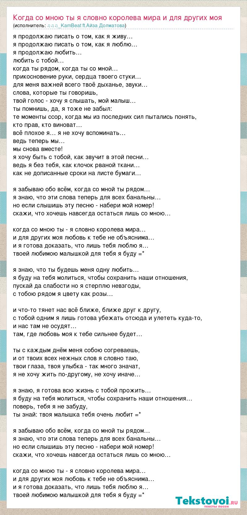 я продолжаю писать о том, как я живу… я продолжаю писать о том, как я люблю… я продолжаю любить… любить с тобой… когда ты рядом, когда ты со мной… прикосновение руки, сердца твоего стуки… для меня важней всего твоё дыханье, звуки… слова, которые ты говоришь, твой голос - хочу я слышать, мой малыш… ты помнишь, да, я тоже не забыл: те моменты ссор, когда мы из последних сил пытались понять, кто прав, кто виноват… всё плохое я… я не хочу вспоминать… ведь теперь мы… мы снова вместе! я хочу быть с тобой, как звучит в этой песни… ведь я без тебя, как клочок рваной ткани… как не дописанные сроки на листе бумаги… я забываю обо всём, когда со мной ты рядом… я знаю, что эти слова теперь для всех банальны… но если слышишь эту песню - набери мой номер! скажи, что хочешь навсегда остаться лишь со мною… когда со мною ты - я словно королева мира… и для других моя любовь к тебе не объяснима… и я готова доказать, что лишь тебя люблю я… твоей любимою малышкой для тебя я буду =* я знаю, что ты будешь меня одну любить… я буду на тебя молиться, чтобы сохранить наши отношения, пускай да слабости но я стерплю невзгоды, с тобою рядом я цвету как розы… и что-то тянет нас всё ближе, ближе друг к другу, с тобой одним я лишь готова убежать отсюда и улететь куда-то, и нас там не осудят… там, где любовь моя к тебе сильнее будет… ты с каждым днём меня собою согреваешь, и от твоих всех нежных слов я словно таю, твои глаза, твоя улыбка - так много значат, я не хочу жить по-другому, не хочу иначе… я знаю, я готова всю жизнь с тобой прожить… я буду на тебя молиться, чтобы сохранить наши отношения… поверь, тебя я не забуду, ты знай: твоя малышка тебя очень любит =* я забываю обо всём, когда со мной ты рядом… я знаю, что эти слова теперь для всех банальны… но если слышишь эту песню - набери мой номер! скажи, что хочешь навсегда остаться лишь со мною… когда со мною ты - я словно королева мира… и для других моя любовь к тебе не объяснима… и я готова доказать, что лишь тебя люблю я… твоей любимою малышкой для тебя я буду =*