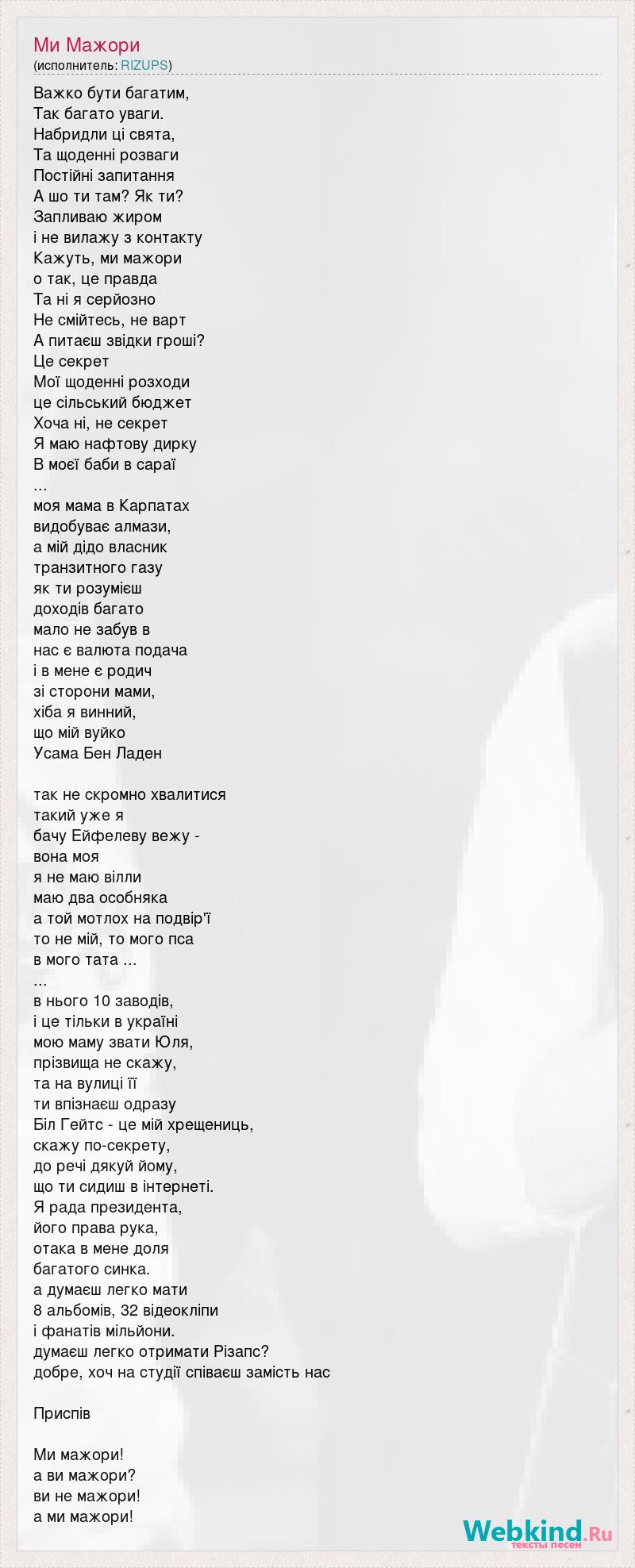 Важко бути багатим, Так багато уваги. Набридли ці свята, Та щоденні розваги Постійні запитання А шо ти там? Як ти? Запливаю жиром і не вилажу з контакту Кажуть, ми мажори о так, це правда Та ні я серйозно Не смійтесь, не варт А питаєш звідки гроші? Це секрет Мої щоденні розходи це сільський бюджет Хоча ні, не секрет Я маю нафтову дирку В моєї баби в сараї ... моя мама в Карпатах видобуває алмази, а мій дідо власник транзитного газу як ти розумієш доходів багато мало не забув в нас є валюта подача і в мене є родич зі сторони мами, хіба я винний, що мій вуйко Усама Бен Ладен так не скромно хвалитися такий уже я бачу Ейфелеву вежу - вона моя я не маю вілли маю два особняка а той мотлох на подвір'ї то не мій, то мого пса в мого тата ... ... в нього 10 заводів, і це тільки в україні мою маму звати Юля, прізвища не скажу, та на вулиці її ти впізнаєш одразу Біл Гейтс - це мій хрещениць, скажу по-секрету, до речі дякуй йому, що ти сидиш в інтернеті. Я рада президента, його права рука, отака в мене доля багатого синка. а думаєш легко мати 8 альбомів, 32 відеокліпи і фанатів мільйони. думаєш легко отримати Різапс? добре, хоч на студії співаєш замість нас Приспів Ми мажори! а ви мажори? ви не мажори! а ми мажори!