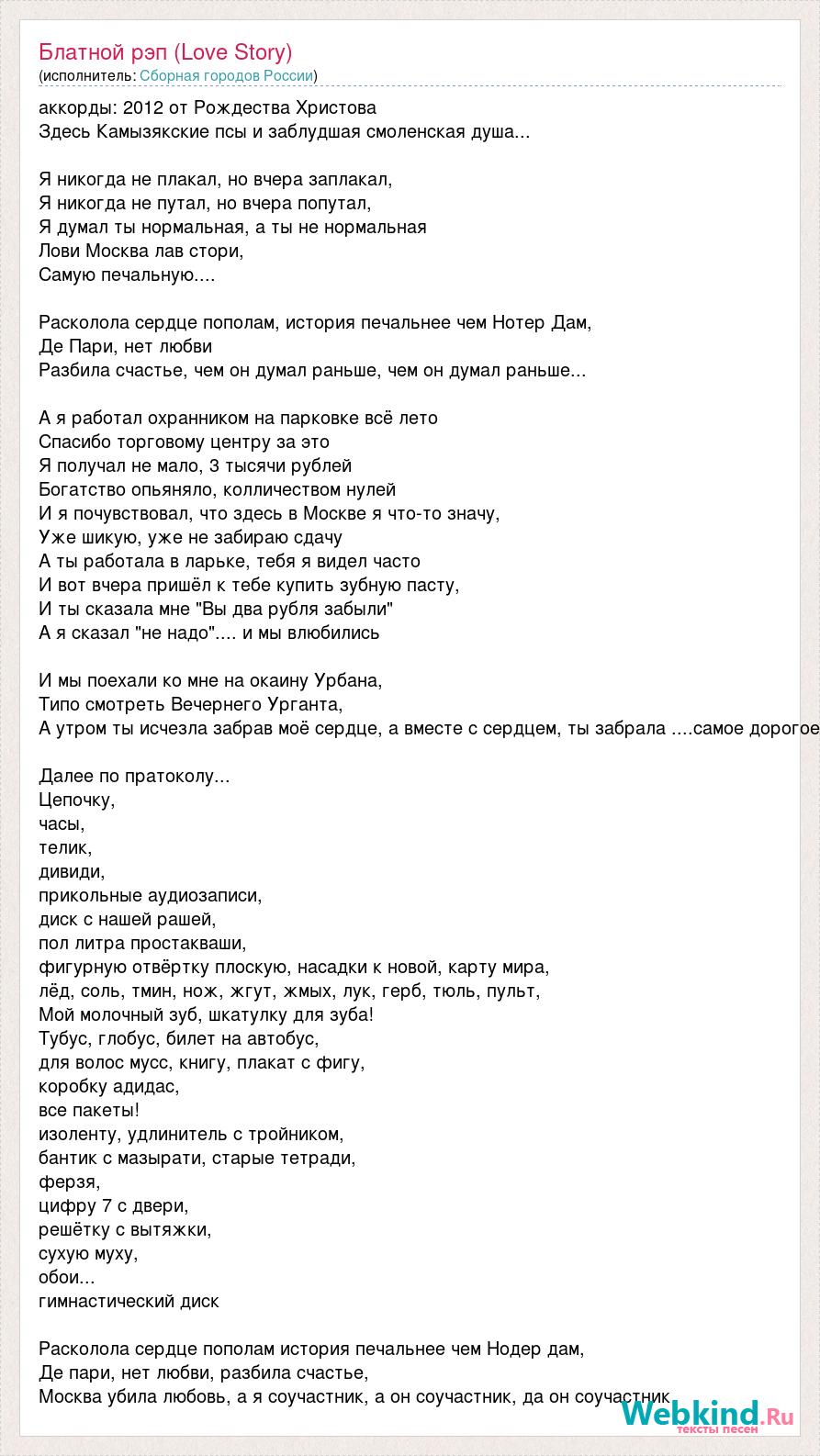 аккорды: 2012 от Рождества Христова Здесь Камызякские псы и заблудшая смоленская душа... Я никогда не плакал, но вчера заплакал, Я никогда не путал, но вчера попутал, Я думал ты нормальная, а ты не нормальная Лови Москва лав стори, Самую печальную.... Расколола сердце пополам, история печальнее чем Нотер Дам, Де Пари, нет любви Разбила счастье, чем он думал раньше, чем он думал раньше... А я работал охранником на парковке всё лето Спасибо торговому центру за это Я получал не мало, 3 тысячи рублей Богатство опьяняло, колличеством нулей И я почувствовал, что здесь в Москве я что-то значу, Уже шикую, уже не забираю сдачу А ты работала в ларьке, тебя я видел часто И вот вчера пришёл к тебе купить зубную пасту, И ты сказала мне "Вы два рубля забыли" А я сказал "не надо".... и мы влюбились И мы поехали ко мне на окаину Урбана, Типо смотреть Вечернего Урганта, А утром ты исчезла забрав моё сердце, а вместе с сердцем, ты забрала ....самое дорогое Далее по пратоколу... Цепочку, часы, телик, дивиди, прикольные аудиозаписи, диск с нашей рашей, пол литра простакваши, фигурную отвёртку плоскую, насадки к новой, карту мира, лёд, соль, тмин, нож, жгут, жмых, лук, герб, тюль, пульт, Мой молочный зуб, шкатулку для зуба! Тубус, глобус, билет на автобус, для волос мусс, книгу, плакат с фигу, коробку адидас, все пакеты! изоленту, удлинитель с тройником, бантик с мазырати, старые тетради, ферзя, цифру 7 с двери, решётку с вытяжки, сухую муху, обои... гимнастический диск Расколола сердце пополам история печальнее чем Нодер дам, Де пари, нет любви, разбила счастье, Москва убила любовь, а я соучастник, а он соучастник, да он соучастник