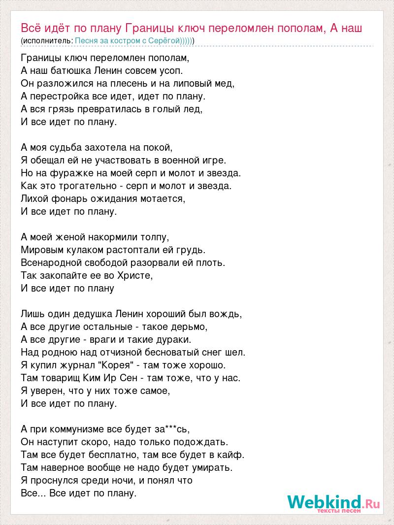 Главная→Исполнители→Песня за костром с Серёгой)))))→Всё идёт по плану Границы ключ переломлен пополам, А наш батюшка Ленин совсе