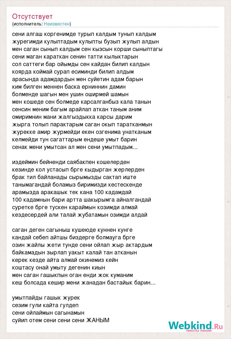 сени алгаш коргенимде турып калдым тунып калдым журегимди кулыптадым кулыпты бузып жулып алдын мен саган сынып калдым сен кызсын корши сыныптагы сени маган караткан сенин татти кылыктарын сол саттеги бар ойымды сен кайдан билип калдын коярда коймай сурап есиминди билип алдым арасында адамдардын мен суйетин адам барын ким билген меннен баска ерниннин дамин болменде шагын мен ушин оширмей шамын мен кошеде сен болмеде карсалганбыз кала танын сенсин меним багым арайлап аткан таным аним омиримнин мани жалгыздыкка карсы дарим жырга толып парактарым саган окып таратканмын журекке амир журмейди екен озгенима унатканым келмейди тун сагаттарым ендеше умыт барин сенак мени умытсан ал мен сени умытпадым... издеймин бейненди саябакпен кошелерден кезинде кол устасып брге кыдырган жерлерден брак тил байланады сырымызды сактап иште танымагандай боламыз биримизди кестескенде арамызда аракашык тек кана 100 кадамдай 100 кадамнын бари артта шакырымга айналгандай суретке брге тускен караймын козимди алмай кездесердей али талай жубатамын озимди алдай саган деген сагыныш кушеюде куннен кунге кандай себеп айтшы биздерге болмауга брге озин жайлы жети тунде сени ойлап жыр актардым байкамадын зырлап уакыт калай тан атканын керек кезде айта алмай окинемиз кейн коштасу онай умыту дегенин киын мен саган гашыкпын оган енди жок куманим кеш болсада кешир мени жанадан бастайык барин... умытпайды гашык журек сезим гули кайта гулдеп сени ойлаймын сагынамын суйип отем сени сени сени ЖАНЫМ