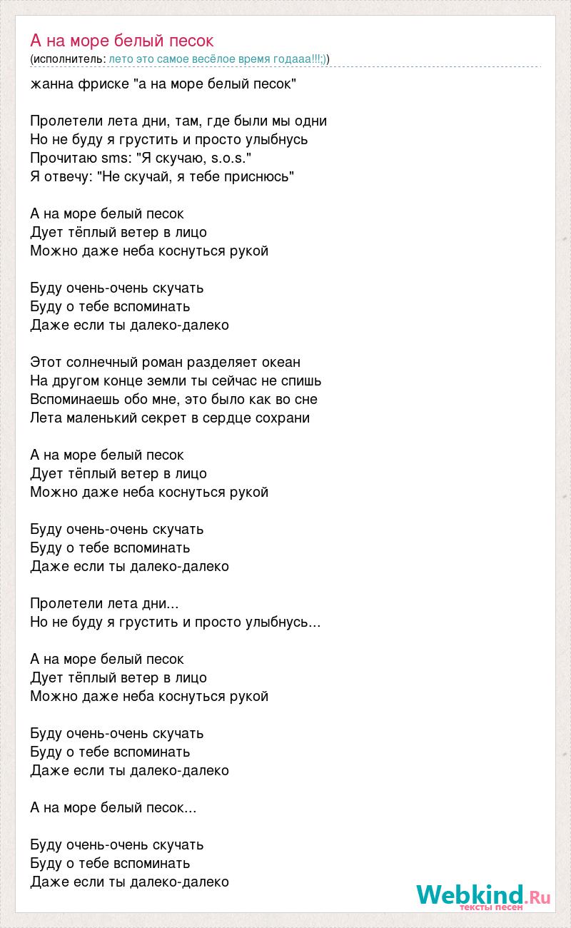 жанна фриске "а на море белый песок" Пролетели лета дни, там, где были мы одни Но не буду я грустить и просто улыбнусь Прочитаю sms: "Я скучаю, s.o.s." Я отвечу: "Не скучай, я тебе приснюсь" А на море белый песок Дует тёплый ветер в лицо Можно даже неба коснуться рукой Буду очень-очень скучать Буду о тебе вспоминать Даже если ты далеко-далеко Этот солнечный роман разделяет океан На другом конце земли ты сейчас не спишь Вспоминаешь обо мне, это было как во сне Лета маленький секрет в сердце сохрани А на море белый песок Дует тёплый ветер в лицо Можно даже неба коснуться рукой Буду очень-очень скучать Буду о тебе вспоминать Даже если ты далеко-далеко Пролетели лета дни... Но не буду я грустить и просто улыбнусь... А на море белый песок Дует тёплый ветер в лицо Можно даже неба коснуться рукой Буду очень-очень скучать Буду о тебе вспоминать Даже если ты далеко-далеко А на море белый песок... Буду очень-очень скучать Буду о тебе вспоминать Даже если ты далеко-далеко