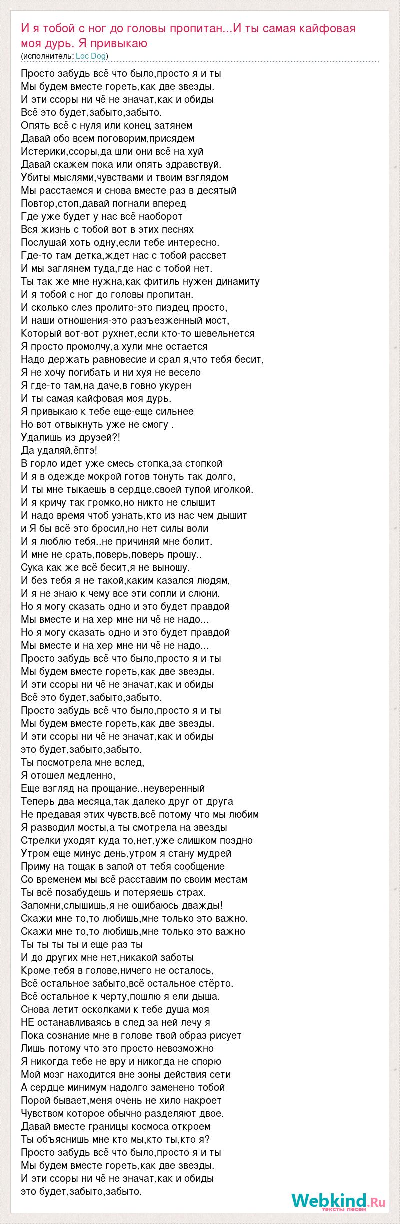Просто забудь всё что было,просто я и ты Мы будем вместе гореть,как две звезды. И эти ссоры ни чё не значат,как и обиды Всё это будет,забыто,забыто. Опять всё с нуля или конец затянем Давай обо всем поговорим,присядем Истерики,ссоры,да шли они всё на хуй Давай скажем пока или опять здравствуй. Убиты мыслями,чувствами и твоим взглядом Мы расстаемся и снова вместе раз в десятый Повтор,стоп,давай погнали вперед Где уже будет у нас всё наоборот Вся жизнь с тобой вот в этих песнях Послушай хоть одну,если тебе интересно. Где-то там детка,ждет нас с тобой рассвет И мы заглянем туда,где нас с тобой нет. Ты так же мне нужна,как фитиль нужен динамиту И я тобой с ног до головы пропитан. И сколько слез пролито-это пиздец просто, И наши отношения-это разъезженный мост, Который вот-вот рухнет,если кто-то шевельнется Я просто промолчу,а хули мне остается Надо держать равновесие и срал я,что тебя бесит, Я не хочу погибать и ни хуя не весело Я где-то там,на даче,в говно укурен И ты самая кайфовая моя дурь. Я привыкаю к тебе еще-еще сильнее Но вот отвыкнуть уже не смогу . Удалишь из друзей?! Да удаляй,ёптэ! В горло идет уже смесь стопка,за стопкой И я в одежде мокрой готов тонуть так долго, И ты мне тыкаешь в сердце.своей тупой иголкой. И я кричу так громко,но никто не слышит И надо время чтоб узнать,кто из нас чем дышит и Я бы всё это бросил,но нет силы воли И я люблю тебя..не причиняй мне болит. И мне не срать,поверь,поверь прошу.. Сука как же всё бесит,я не выношу. И без тебя я не такой,каким казался людям, И я не знаю к чему все эти сопли и слюни. Но я могу сказать одно и это будет правдой Мы вместе и на хер мне ни чё не надо... Но я могу сказать одно и это будет правдой Мы вместе и на хер мне ни чё не надо... Просто забудь всё что было,просто я и ты Мы будем вместе гореть,как две звезды. И эти ссоры ни чё не значат,как и обиды Всё это будет,забыто,забыто. Просто забудь всё что было,просто я и ты Мы будем вместе гореть,как две звезды. И эти ссоры ни чё не значат,как и обиды это будет,забыто,забыто. Ты посмотрела мне вслед, Я отошел медленно, Еще взгляд на прощание..неуверенный Теперь два месяца,так далеко друг от друга Не предавая этих чувств.всё потому что мы любим Я разводил мосты,а ты смотрела на звезды Стрелки уходят куда то,нет,уже слишком поздно Утром еще минус день,утром я стану мудрей Приму на тощак в запой от тебя сообщение Со временем мы всё расставим по своим местам Ты всё позабудешь и потеряешь страх. Запомни,слышишь,я не ошибаюсь дважды! Скажи мне то,то любишь,мне только это важно. Скажи мне то,то любишь,мне только это важно Ты ты ты ты и еще раз ты И до других мне нет,никакой заботы Кроме тебя в голове,ничего не осталось, Всё остальное забыто,всё остальное стёрто. Всё остальное к черту,пошлю я ели дыша. Снова летит осколками к тебе душа моя НЕ останавливаясь в след за ней лечу я Пока сознание мне в голове твой образ рисует Лишь потому что это просто невозможно Я никогда тебе не вру и никогда не спорю Мой мозг находится вне зоны действия сети А сердце минимум надолго заменено тобой Порой бывает,меня очень не хило накроет Чувством которое обычно разделяют двое. Давай вместе границы космоса откроем Ты объяснишь мне кто мы,кто ты,кто я? Просто забудь всё что было,просто я и ты Мы будем вместе гореть,как две звезды. И эти ссоры ни чё не значат,как и обиды это будет,забыто,забыто.
