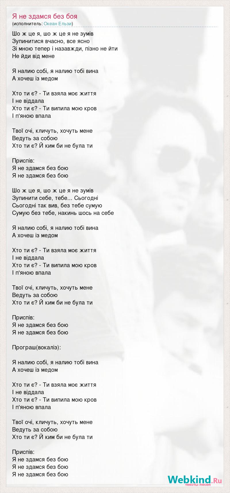 Шо ж це я, шо ж це я не зумів Зупинитися вчасно, все ясно Зі мною тепер і назавжди, пізно не йти Не йди від мене Я налию собі, я налию тобі вина А хочеш із медом Хто ти є? - Ти взяла моє життя І не віддала Хто ти є? - Ти випила мою кров І п'яною впала Твої очі, кличуть, хочуть мене Ведуть за собою Хто ти є? Й ким би не була ти Приспів: Я не здамся без бою Я не здамся без бою Шо ж це я, шо ж це я не зумів Зупинити себе, тебе... Сьогодні Сьогодні так вив, без тебе сумую Сумую без тебе, накинь шось на себе Я налию собі, я налию тобі вина А хочеш із медом Хто ти є? - Ти взяла моє життя І не віддала Хто ти є? - Ти випила мою кров І п'яною впала Твої очі, кличуть, хочуть мене Ведуть за собою Хто ти є? Й ким би не була ти Приспів: Я не здамся без бою Я не здамся без бою Програш(вокаліз): Я налию собі, я налию тобі вина А хочеш із медом Хто ти є? - Ти взяла моє життя І не віддала Хто ти є? - Ти випила мою кров І п'яною впала Твої очі, кличуть, хочуть мене Ведуть за собою Хто ти є? Й ким би не була ти Приспів: Я не здамся без бою Я не здамся без бою Я не здамся без бою