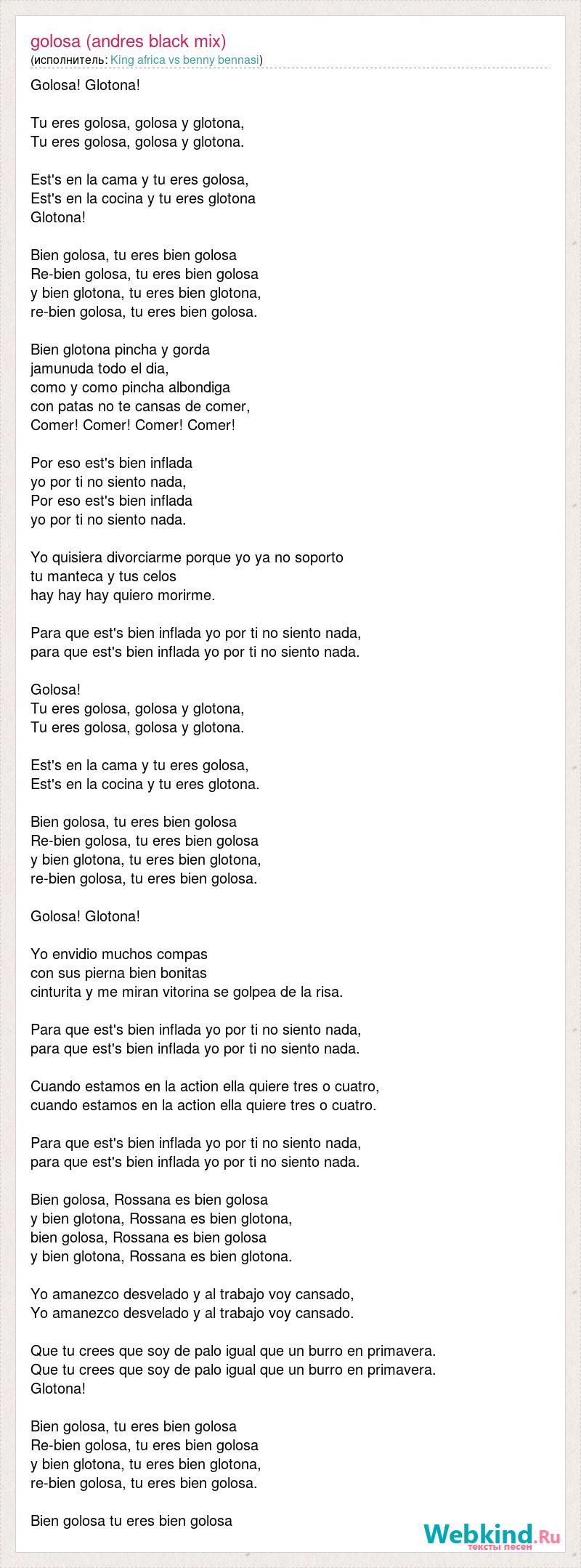 Golosa! Glotona! Tu eres golosa, golosa y glotona, Tu eres golosa, golosa y glotona. Est's en la cama y tu eres golosa, Est's en la cocina y tu eres glotona Glotona! Bien golosa, tu eres bien golosa Re-bien golosa, tu eres bien golosa y bien glotona, tu eres bien glotona, re-bien golosa, tu eres bien golosa. Bien glotona pincha y gorda jamunuda todo el dia, como y como pincha albondiga con patas no te cansas de comer, Comer! Comer! Comer! Comer! Por eso est's bien inflada yo por ti no siento nada, Por eso est's bien inflada yo por ti no siento nada. Yo quisiera divorciarme porque yo ya no soporto tu manteca y tus celos hay hay hay quiero morirme. Para que est's bien inflada yo por ti no siento nada, para que est's bien inflada yo por ti no siento nada. Golosa! Tu eres golosa, golosa y glotona, Tu eres golosa, golosa y glotona. Est's en la cama y tu eres golosa, Est's en la cocina y tu eres glotona. Bien golosa, tu eres bien golosa Re-bien golosa, tu eres bien golosa y bien glotona, tu eres bien glotona, re-bien golosa, tu eres bien golosa. Golosa! Glotona! Yo envidio muchos compas con sus pierna bien bonitas cinturita y me miran vitorina se golpea de la risa. Para que est's bien inflada yo por ti no siento nada, para que est's bien inflada yo por ti no siento nada. Cuando estamos en la action ella quiere tres o cuatro, cuando estamos en la action ella quiere tres o cuatro. Para que est's bien inflada yo por ti no siento nada, para que est's bien inflada yo por ti no siento nada. Bien golosa, Rossana es bien golosa y bien glotona, Rossana es bien glotona, bien golosa, Rossana es bien golosa y bien glotona, Rossana es bien glotona. Yo amanezco desvelado y al trabajo voy cansado, Yo amanezco desvelado y al trabajo voy cansado. Que tu crees que soy de palo igual que un burro en primavera. Que tu crees que soy de palo igual que un burro en primavera. Glotona! Bien golosa, tu eres bien golosa Re-bien golosa, tu eres bien golosa y bien glotona, tu eres bien glotona, re-bien golosa, tu eres bien golosa. Bien golosa tu eres bien golosa