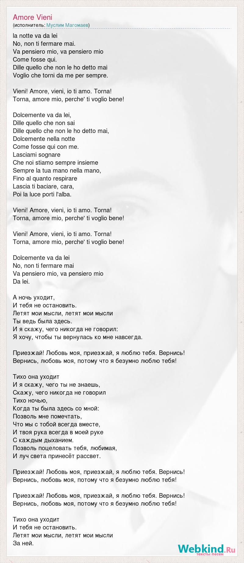 la notte va da lei No, non ti fermare mai. Va pensiero mio, va pensiero mio Come fosse qui. Dille quello che non le ho detto mai Voglio che torni da me per sempre. Vieni! Amore, vieni, io ti amo. Torna! Torna, amore mio, perche' ti voglio bene! Dolcemente va da lei, Dille quello che non sai Dille quello che non le ho detto mai, Dolcemente nella notte Come fosse qui con me. Lasciami sognare Che noi stiamo sempre insieme Sempre la tua mano nella mano, Fino al quanto respirare Lascia ti baciare, cara, Poi la luce porti l'alba. Vieni! Amore, vieni, io ti amo. Torna! Torna, amore mio, perche' ti voglio bene! Vieni! Amore, vieni, io ti amo. Torna! Torna, amore mio, perche' ti voglio bene! Dolcemente va da lei No, non ti fermare mai Va pensiero mio, va pensiero mio Da lei. А ночь уходит, И тебя не остановить. Летят мои мысли, летят мои мысли Ты ведь была здесь. И я скажу, чего никогда не говорил: Я хочу, чтобы ты вернулась ко мне навсегда. Приезжай! Любовь моя, приезжай, я люблю тебя. Вернись! Вернись, любовь моя, потому что я безумно люблю тебя! Тихо она уходит И я скажу, чего ты не знаешь, Скажу, чего никогда не говорил Тихо ночью, Когда ты была здесь со мной: Позволь мне помечтать, Что мы с тобой всегда вместе, И твоя рука всегда в моей руке С каждым дыханием. Позволь поцеловать тебя, любимая, И луч света принесёт рассвет. Приезжай! Любовь моя, приезжай, я люблю тебя. Вернись! Вернись, любовь моя, потому что я безумно люблю тебя! Приезжай! Любовь моя, приезжай, я люблю тебя. Вернись! Вернись, любовь моя, потому что я безумно люблю тебя! Тихо она уходит И тебя не остановить. Летят мои мысли, летят мои мысли За ней.