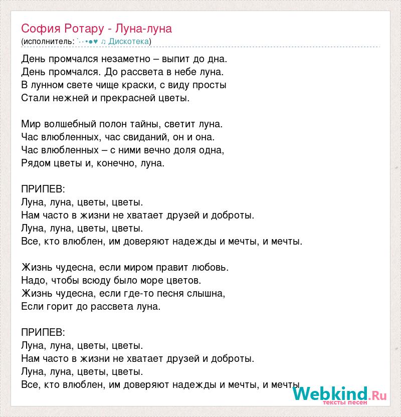 День промчался незаметно – выпит до дна. День промчался. До рассвета в небе луна. В лунном свете чище краски, с виду просты Стали нежней и прекрасней цветы. Мир волшебный полон тайны, светит луна. Час влюбленных, час свиданий, он и она. Час влюбленных – с ними вечно доля одна, Рядом цветы и, конечно, луна. ПРИПЕВ: Луна, луна, цветы, цветы. Нам часто в жизни не хватает друзей и доброты. Луна, луна, цветы, цветы. Все, кто влюблен, им доверяют надежды и мечты, и мечты. Жизнь чудесна, если миром правит любовь. Надо, чтобы всюду было море цветов. Жизнь чудесна, если где-то песня слышна, Если горит до рассвета луна. ПРИПЕВ: Луна, луна, цветы, цветы. Нам часто в жизни не хватает друзей и доброты. Луна, луна, цветы, цветы. Все, кто влюблен, им доверяют надежды и мечты, и мечты.