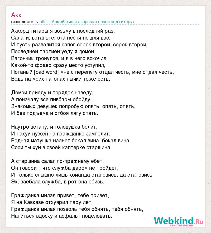 Аккорд гитары я возьму в последний раз, Салаги, встаньте, эта песня не для вас, И пусть развалится сапог сорок второй, сорок второй, Последней партией уеду я домой. Вагончик тронулся, и я в него вскочил, Какой-то фраер сразу место уступил, Поганый [bad word] мне с перепугу отдал честь, мне отдал честь, Ведь на моих пагонах лычки тоже есть. Домой приеду и порядок наведу, А поначалу все пивбары обойду, Знакомых девушек попробую опять, опять, опять, И без подъема и отбоя лягу спать. Наутро встану, и головушка болит, И нахуй нужен на гражданке замполит, Родная матушка нальет бокал вина, бокал вина, Соси ты хуй в своей каптерке старшина. А старшина салаг по-прежнему ебет, Он говорит, что служба даром не пройдет, И только слышно лишь команда становись, да становись Эх, заебала служба, в рот она ебись. Гражданка милая привет, тебе привет, Я на Кавказе отхуярил пару лет, Гражданка милая позволь тебя обнять, тебя обнять, Напиться вдоску и асфальт поцеловать.
