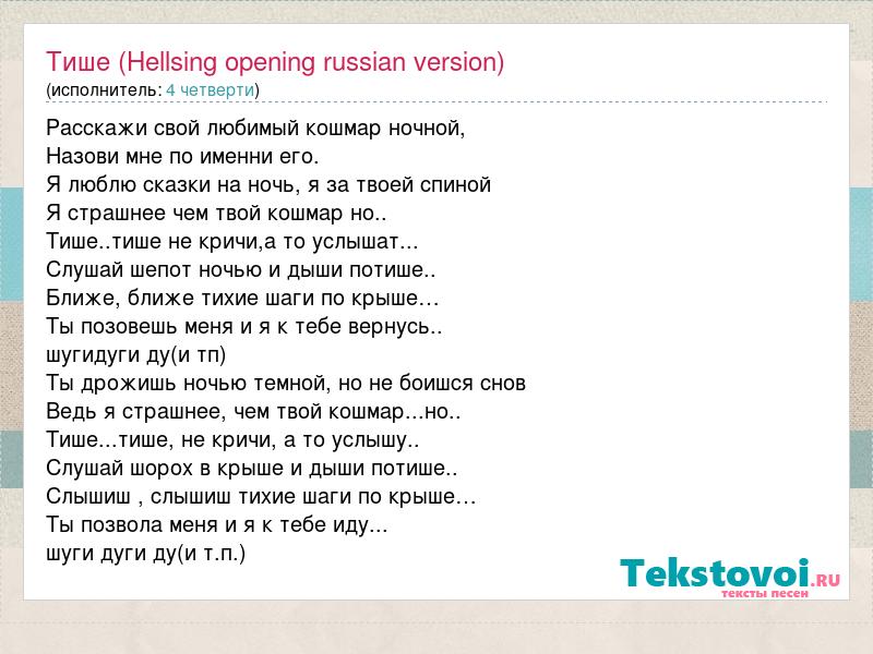 Расскажи свой любимый кошмар ночной, Назови мне по именни его. Я люблю сказки на ночь, я за твоей спиной Я страшнее чем твой кошмар но.. Тише..тише не кричи,а то услышат... Слушай шепот ночью и дыши потише.. Ближе, ближе тихие шаги по крыше… Ты позовешь меня и я к тебе вернусь.. шугидуги ду(и тп) Ты дрожишь ночью темной, но не боишся снов Ведь я страшнее, чем твой кошмар...но.. Тише...тише, не кричи, а то услышу.. Слушай шорох в крыше и дыши потише.. Слышиш , слышиш тихие шаги по крыше… Ты позвола меня и я к тебе иду... шуги дуги ду(и т.п.)