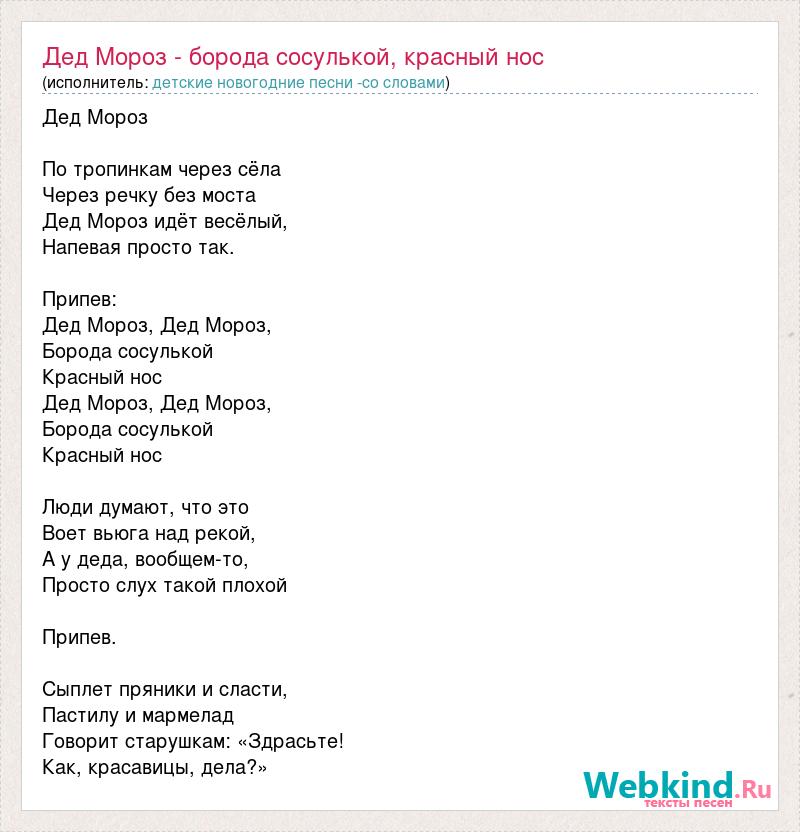 Дед Мороз По тропинкам через сёла Через речку без моста Дед Мороз идёт весёлый, Напевая просто так. Припев: Дед Мороз, Дед Мороз, Борода сосулькой Красный нос Дед Мороз, Дед Мороз, Борода сосулькой Красный нос Люди думают, что это Воет вьюга над рекой, А у деда, вообщем-то, Просто слух такой плохой Припев. Сыплет пряники и сласти, Пастилу и мармелад Говорит старушкам: «Здрасьте! Как, красавицы, дела?»