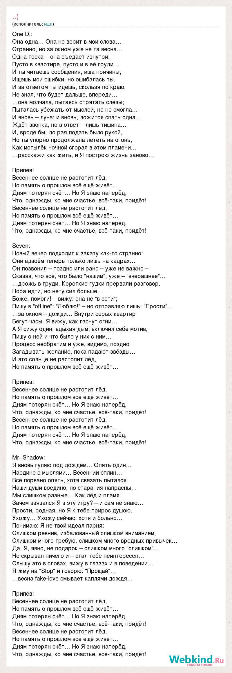 One D.: Она одна… Она не верит в мои слова… Странно, но за окном уже не та весна… Одна тоска – она съедает изнутри. Пусто в квартире, пусто и в её груди… И ты читаешь сообщения, ища причины; Ищешь мои ошибки, но ошибалась ты. И за ответом ты идёшь, скользя по краю, Не зная, что будет дальше, впереди… …она молчала, пытаясь спрятать слёзы; Пыталась убежать от мыслей, но не смогла… И вновь – луна; и вновь, ложится спать одна… Ждёт звонка, но в ответ – лишь тишина… И, вроде бы, до рая подать было рукой, Но ты упорно продолжала лететь на огонь, Как мотылёк ночной сгорая в этом пламени… …расскажи как жить, и Я построю жизнь заново… Припев: Весеннее солнце не растопит лёд, Но память о прошлом всё ещё живёт… Дням потерян счёт… Но Я знаю наперёд, Что, однажды, ко мне счастье, всё-таки, придёт! Весеннее солнце не растопит лёд, Но память о прошлом всё ещё живёт… Дням потерян счёт… Но Я знаю наперёд, Что, однажды, ко мне счастье, всё-таки, придёт! Seven: Новый вечер подходит к закату как-то странно: Они вдвоём теперь только лишь на кадрах… Он позвонил – поздно или рано – уже не важно – Сказав, что всё, что было "нашим", уже – "вчерашнее"… …дрожь в груди. Короткие гудки прервали разговор. Пора идти, но нету сил больше… Боже, помоги! – вижу: она не "в сети"; Пишу в "offline": "Люблю!" – но отправляю лишь: "Прости"… …за окном – дожди… Внутри серых квартир Бегут часы. Я вижу, как гаснут огни… А Я сижу один, вдыхая дым; включил себе мотив, Пишу о ней и что было у них с ним… Процесс необратим и уже, видимо, поздно Загадывать желание, пока падают звёзды… И это солнце не растопит лёд, Но память о прошлом всё ещё живёт… Припев: Весеннее солнце не растопит лёд, Но память о прошлом всё ещё живёт… Дням потерян счёт… Но Я знаю наперёд, Что, однажды, ко мне счастье, всё-таки, придёт! Весеннее солнце не растопит лёд, Но память о прошлом всё ещё живёт… Дням потерян счёт… Но Я знаю наперёд, Что, однажды, ко мне счастье, всё-таки, придёт! Mr. Shadow: Я вновь гуляю под дождём… Опять один… Наедине с мыслями… Весенний сплин… Всё порвано опять, хотя связать пытался Наши души воедино, но старания напрасны… Мы слишком разные… Как лёд и пламя. Зачем ввязался Я в эту игру? – и сам не знаю… Прости, родная, но Я к тебе прирос душою. Ухожу… Ухожу сейчас, хотя и больно… Понимаю: Я не твой идеал парня: Слишком ревнив, избалованный слишком вниманием, Слишком много требую, слишком много вредных привычек… Да, Я, явно, не подарок – слишком много "слишком"… Не скрывал ничего и – стал тебе неинтересен… Слышу это в словах, вижу в глазах и в поведении… Я жму на "Stop" и говорю: "Прощай"… …весна fake-love смывает каплями дождя… Припев: Весеннее солнце не растопит лёд, Но память о прошлом всё ещё живёт… Дням потерян счёт… Но Я знаю наперёд, Что, однажды, ко мне счастье, всё-таки, придёт! Весеннее солнце не растопит лёд, Но память о прошлом всё ещё живёт… Дням потерян счёт… Но Я знаю наперёд, Что, однажды, ко мне счастье, всё-таки, придёт!