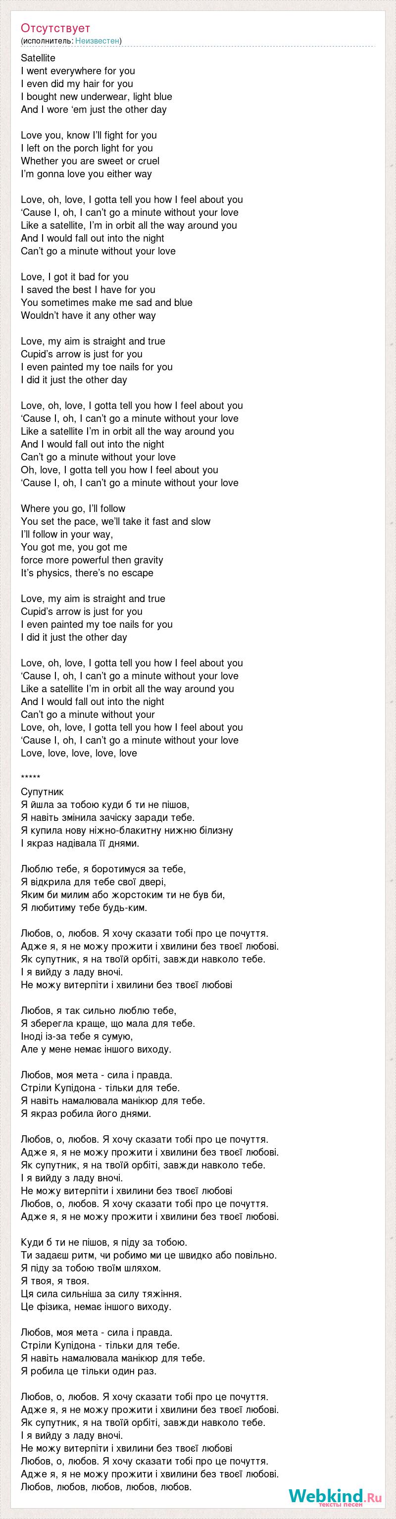 Satellite I went everywhere for you I even did my hair for you I bought new underwear, light blue And I wore ‘em just the other day Love you, know I’ll fight for you I left on the porch light for you Whether you are sweet or cruel I’m gonna love you either way Love, oh, love, I gotta tell you how I feel about you ‘Cause I, oh, I can’t go a minute without your love Like a satellite, I’m in orbit all the way around you And I would fall out into the night Can’t go a minute without your love Love, I got it bad for you I saved the best I have for you You sometimes make me sad and blue Wouldn’t have it any other way Love, my aim is straight and true Cupid’s arrow is just for you I even painted my toe nails for you I did it just the other day Love, oh, love, I gotta tell you how I feel about you ‘Cause I, oh, I can’t go a minute without your love Like a satellite I’m in orbit all the way around you And I would fall out into the night Can’t go a minute without your love Oh, love, I gotta tell you how I feel about you ‘Cause I, oh, I can’t go a minute without your love Where you go, I’ll follow You set the pace, we’ll take it fast and slow I’ll follow in your way, You got me, you got me force more powerful then gravity It’s physics, there’s no escape Love, my aim is straight and true Cupid’s arrow is just for you I even painted my toe nails for you I did it just the other day Love, oh, love, I gotta tell you how I feel about you ‘Cause I, oh, I can’t go a minute without your love Like a satellite I’m in orbit all the way around you And I would fall out into the night Can’t go a minute without your Love, oh, love, I gotta tell you how I feel about you ‘Cause I, oh, I can’t go a minute without your love Love, love, love, love, love ***** Супутник Я йшла за тобою куди б ти не пішов, Я навіть змінила зачіску заради тебе. Я купила нову ніжно-блакитну нижню білизну І якраз надівала її днями. Люблю тебе, я боротимуся за тебе, Я відкрила для тебе свої двері, Яким би милим або жорстоким ти не був би, Я любитиму тебе будь-ким. Любов, о, любов. Я хочу сказати тобі про це почуття. Адже я, я не можу прожити і хвилини без твоєї любові. Як супутник, я на твоїй орбіті, завжди навколо тебе. І я вийду з ладу вночі. Не можу витерпіти і хвилини без твоєї любові Любов, я так сильно люблю тебе, Я зберегла краще, що мала для тебе. Іноді із-за тебе я сумую, Але у мене немає іншого виходу. Любов, моя мета - сила і правда. Стріли Купідона - тільки для тебе. Я навіть намалювала манікюр для тебе. Я якраз робила його днями. Любов, о, любов. Я хочу сказати тобі про це почуття. Адже я, я не можу прожити і хвилини без твоєї любові. Як супутник, я на твоїй орбіті, завжди навколо тебе. І я вийду з ладу вночі. Не можу витерпіти і хвилини без твоєї любові Любов, о, любов. Я хочу сказати тобі про це почуття. Адже я, я не можу прожити і хвилини без твоєї любові. Куди б ти не пішов, я піду за тобою. Ти задаєш ритм, чи робимо ми це швидко або повільно. Я піду за тобою твоїм шляхом. Я твоя, я твоя. Ця сила сильніша за силу тяжіння. Це фізика, немає іншого виходу. Любов, моя мета - сила і правда. Стріли Купідона - тільки для тебе. Я навіть намалювала манікюр для тебе. Я робила це тільки один раз. Любов, о, любов. Я хочу сказати тобі про це почуття. Адже я, я не можу прожити і хвилини без твоєї любові. Як супутник, я на твоїй орбіті, завжди навколо тебе. І я вийду з ладу вночі. Не можу витерпіти і хвилини без твоєї любові Любов, о, любов. Я хочу сказати тобі про це почуття. Адже я, я не можу прожити і хвилини без твоєї любові. Любов, любов, любов, любов, любов.