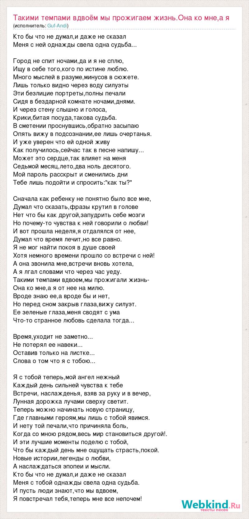 Главная→Исполнители→Guf-Andi→Такими темпами вдвоём мы прожигаем жизнь.Она ко мне,а я от нее на милю...Вроде б