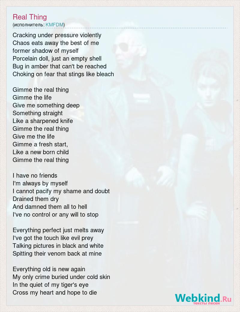 Cracking under pressure violently Chaos eats away the best of me former shadow of myself Porcelain doll, just an empty shell Bug in amber that can't be reached Choking on fear that stings like bleach Gimme the real thing Gimme the life Give me something deep Something straight Like a sharpened knife Gimme the real thing Give me the life Gimme a fresh start, Like a new born child Gimme the real thing I have no friends I'm always by myself I cannot pacify my shame and doubt Drained them dry And damned them all to hell I've no control or any will to stop Everything perfect just melts away I've got the touch like evil prey Talking pictures in black and white Spitting their venom back at mine Everything old is new again My only crime buried under cold skin In the quiet of my tiger's eye Cross my heart and hope to die