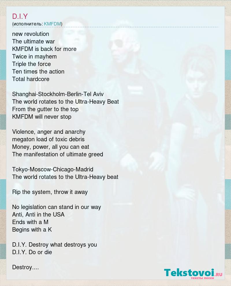 new revolution The ultimate war KMFDM is back for more Twice in mayhem Triple the force Ten times the action Total hardcore Shanghai-Stockholm-Berlin-Tel Aviv The world rotates to the Ultra-Heavy Beat From the gutter to the top KMFDM will never stop Violence, anger and anarchy megaton load of toxic debris Money, power, all you can eat The manifestation of ultimate greed Tokyo-Moscow-Chicago-Madrid The world rotates to the Ultra-Heavy beat Rip the system, throw it away No legislation can stand in our way Anti, Anti in the USA Ends with a M Begins with a K D.I.Y. Destroy what destroys you D.I.Y. Do or die Destroy....