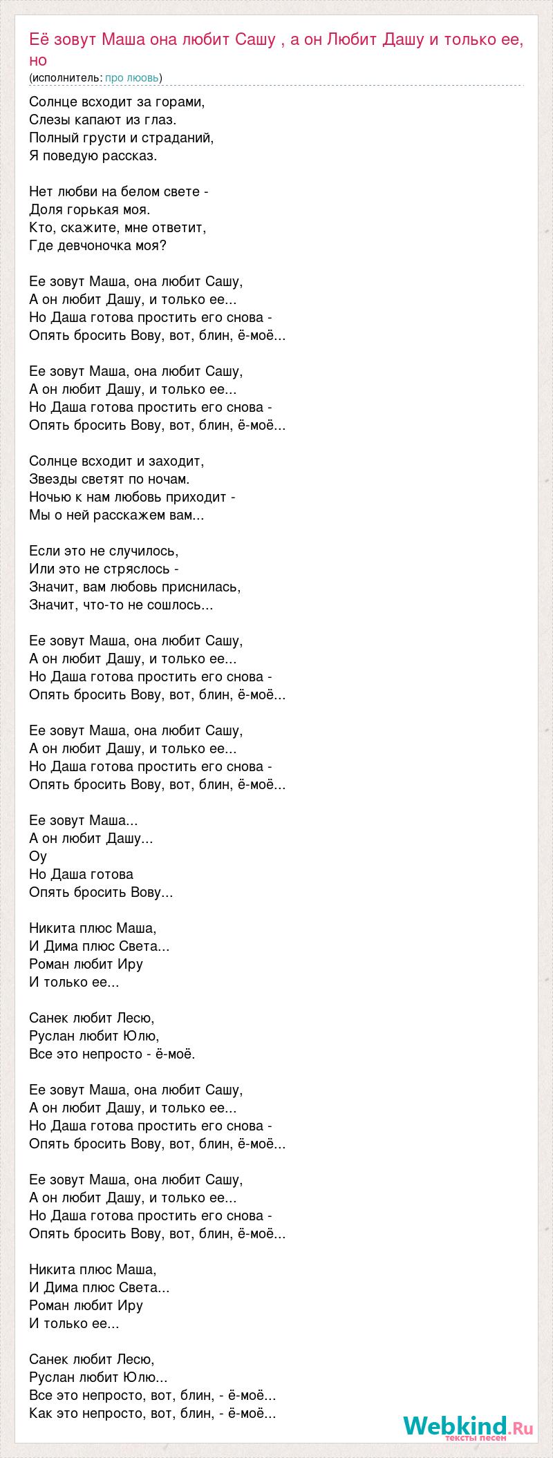 Солнце всходит за горами, Слезы капают из глаз. Полный грусти и страданий, Я поведую рассказ. Нет любви на белом свете - Доля горькая моя. Кто, скажите, мне ответит, Где девчоночка моя? Ее зовут Маша, она любит Сашу, А он любит Дашу, и только ее... Но Даша готова простить его снова - Опять бросить Вову, вот, блин, ё-моё... Ее зовут Маша, она любит Сашу, А он любит Дашу, и только ее... Но Даша готова простить его снова - Опять бросить Вову, вот, блин, ё-моё... Солнце всходит и заходит, Звезды светят по ночам. Ночью к нам любовь приходит - Мы о ней расскажем вам... Если это не случилось, Или это не стряслось - Значит, вам любовь приснилась, Значит, что-то не сошлось... Ее зовут Маша, она любит Сашу, А он любит Дашу, и только ее... Но Даша готова простить его снова - Опять бросить Вову, вот, блин, ё-моё... Ее зовут Маша, она любит Сашу, А он любит Дашу, и только ее... Но Даша готова простить его снова - Опять бросить Вову, вот, блин, ё-моё... Ее зовут Маша... А он любит Дашу... Оу Но Даша готова Опять бросить Вову... Никита плюс Маша, И Дима плюс Света... Роман любит Иру И только ее... Санек любит Лесю, Руслан любит Юлю, Все это непросто - ё-моё. Ее зовут Маша, она любит Сашу, А он любит Дашу, и только ее... Но Даша готова простить его снова - Опять бросить Вову, вот, блин, ё-моё... Ее зовут Маша, она любит Сашу, А он любит Дашу, и только ее... Но Даша готова простить его снова - Опять бросить Вову, вот, блин, ё-моё... Никита плюс Маша, И Дима плюс Света... Роман любит Иру И только ее... Санек любит Лесю, Руслан любит Юлю... Все это непросто, вот, блин, - ё-моё... Как это непросто, вот, блин, - ё-моё...