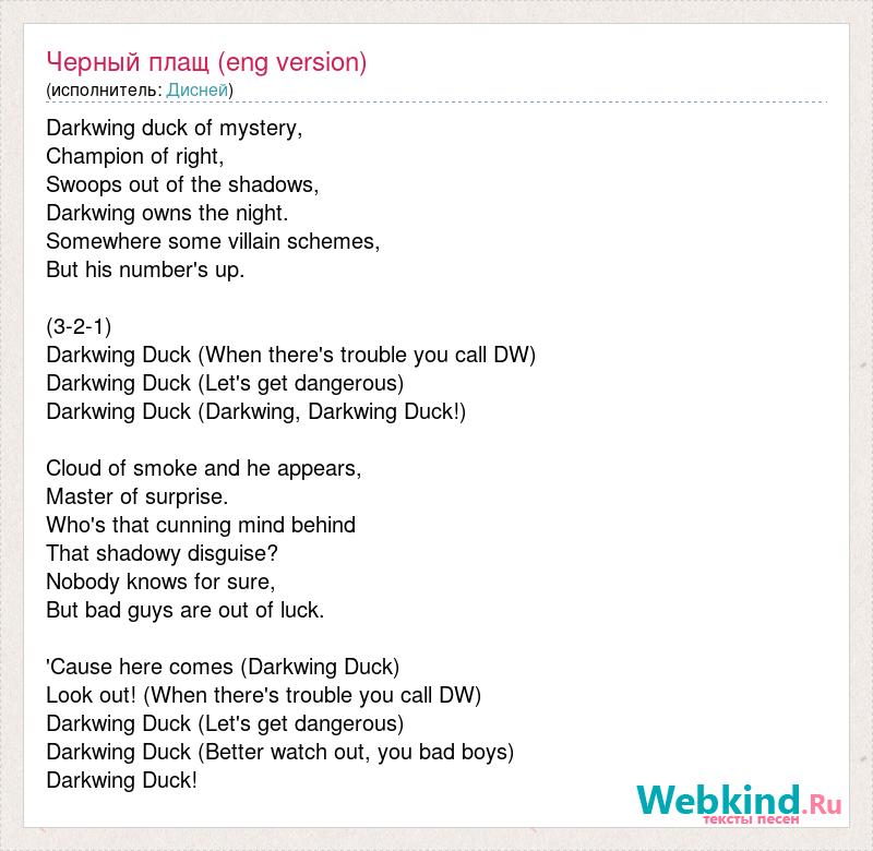 Darkwing duck of mystery, Champion of right, Swoops out of the shadows, Darkwing owns the night. Somewhere some villain schemes, But his number's up. (3-2-1) Darkwing Duck (When there's trouble you call DW) Darkwing Duck (Let's get dangerous) Darkwing Duck (Darkwing, Darkwing Duck!) Cloud of smoke and he appears, Master of surprise. Who's that cunning mind behind That shadowy disguise? Nobody knows for sure, But bad guys are out of luck. 'Cause here comes (Darkwing Duck) Look out! (When there's trouble you call DW) Darkwing Duck (Let's get dangerous) Darkwing Duck (Better watch out, you bad boys) Darkwing Duck!