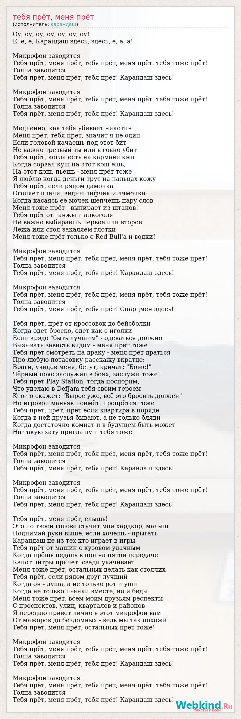 Оу, оу, оу, оу, оу, оу, оу! Е, е, е, Карандаш здесь, здесь, е, а, а! Микрофон заводится Тебя прёт, меня прёт, тебя прёт, меня прёт, тебя тоже прёт! Толпа заводится Тебя прёт, меня прёт, тебя прёт! Карандаш здесь! Микрофон заводится Тебя прёт, меня прёт, тебя прёт, меня прёт, тебя тоже прёт! Толпа заводится Тебя прёт, меня прёт, тебя прёт! Карандаш здесь! Медленно, как тебя убивает никотин Меня прёт, тебя прёт, значит я не один Если головой качаешь под этот бит Не важно трезвый ты или в говно убит Тебя прёт, когда есть на кармане кэш Когда сорвал куш на этот кэш ешь, На этот кэш, пьёшь - меня прёт тоже Я люблю когда деньги трут на пальцах кожу Тебя прёт, если рядом дамочка Оголяет плечи, видны лифчик и лямочки Когда касаясь её мочек шепчешь пару слов Меня тоже прёт - выпирает из штанов! Тебя прёт от ганжы и алкоголя Не важно выбираешь первое или второе Лёжа или стоя закаляем глотки Меня тоже прёт только с Red Bull'а и водки! Микрофон заводится Тебя прёт, меня прёт, тебя прёт, меня прёт, тебя тоже прёт! Толпа заводится Тебя прёт, меня прёт, тебя прёт! Карандаш здесь! Микрофон заводится Тебя прёт, меня прёт, тебя прёт, меня прёт, тебя тоже прёт! Толпа заводится Тебя прёт, меня прёт, тебя прёт! Спарцмен здесь! Тебя прёт, прёт от кроссовок до бейсболки Когда одет броско, одет как с иголки Если крэдо "быть лучшим" - одеваться должно Вызывать зависть видом - меня прёт тоже Тебя прёт смотреть на драку - меня прёт драться Про любую потасовку расскажу вкратце: Враги, увидев меня, бегут, кричат: "Боже!" Чёрный пояс заслужил в боях, заслужи тоже! Тебя прёт Play Station, тогда поспорим, Что уделаю в DefJam тебя своим героем Кто-то скажет: "Вырос уже, всё это бросить должен" Но игровой маньяк поймёт, пропрётся тоже Тебя прёт, прёт, прёт если квартира в поряде Когда в ней друзья бывают, а не только бляди Когда достаточно комнат и в будущем быть может На такую хату приглашу и тебя тоже Микрофон заводится Тебя прёт, меня прёт, тебя прёт, меня прёт, тебя тоже прёт! Толпа заводится Тебя прёт, меня прёт, тебя прёт! Карандаш здесь! Микрофон заводится Тебя прёт, меня прёт, тебя прёт, меня прёт, тебя тоже прёт! Толпа заводится Тебя прёт, меня прёт, тебя прёт! Карандаш здесь! Тебя прёт, меня прёт, слышь! Это по твоей голове стучит мой хардкор, малыш Поднимай руки выше, если хочешь - прыгать Карандаш не из тех кто играет в игры Тебя прёт от машин с кузовом удачным Когда прёшь педаль в пол на пятой передаче Капот литры прячет, сзади укачивает Меня тоже прёт, остальных делать как стоячих Тебя прёт, если рядом друг лучший Когда он - душа, а не только рот и уши Когда не только пьянки вместе, но и беды Меня тоже прёт, всем моим друзьям респекты С проспектов, улиц, кварталов и районов Я передаю привет лично в этот микрофон вам От мажоров до бездомных - ведь мы так похожи Тебя прёт, меня прёт, остальных прёт тоже! Микрофон заводится Тебя прёт, меня прёт, тебя прёт, меня прёт, тебя тоже прёт! Толпа заводится Тебя прёт, меня прёт, тебя прёт! Карандаш здесь! Микрофон заводится Тебя прёт, меня прёт, тебя прёт, меня прёт, тебя тоже прёт! Толпа заводится Тебя прёт, меня прёт, тебя прёт! Карандаш здесь!