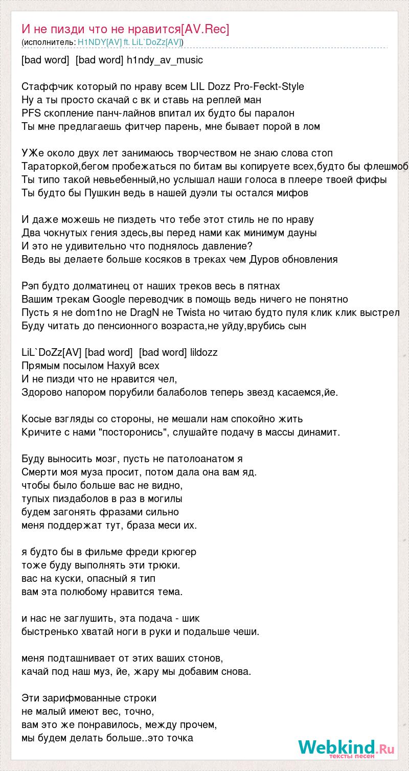 [bad word] [bad word] h1ndy_av_music Стаффчик который по нраву всем LIL Dozz Pro-Feckt-Style Ну а ты просто скачай с вк и ставь на реплей ман PFS скопление панч-лайнов впитал их будто бы паралон Ты мне предлагаешь фитчер парень, мне бывает порой в лом УЖе около двух лет занимаюсь творчеством не знаю слова стоп Тараторкой,бегом пробежаться по битам вы копируете всех,будто бы флешмоб Ты типо такой невьебенный,но услышал наши голоса в плеере твоей фифы Ты будто бы Пушкин ведь в нашей дуэли ты остался мифов И даже можешь не пиздеть что тебе этот стиль не по нраву Два чокнутых гения здесь,вы перед нами как минимум дауны И это не удивительно что поднялось давление? Ведь вы делаете больше косяков в треках чем Дуров обновления Рэп будто долматинец от наших треков весь в пятнах Вашим трекам Google переводчик в помощь ведь ничего не понятно Пусть я не dom1no не DragN не Twista но читаю будто пуля клик клик выстрел Буду читать до пенсионного возраста,не уйду,врубись сын LiL`DoZz[AV] [bad word] [bad word] lildozz Прямым посылом Нахуй всех И не пизди что не нравится чел, Здорово напором порубили балаболов теперь звезд касаемся,йе. Косые взгляды со стороны, не мешали нам спокойно жить Кричите с нами "посторонись", слушайте подачу в массы динамит. Буду выносить мозг, пусть не патолоанатом я Смерти моя муза просит, потом дала она вам яд. чтобы было больше вас не видно, тупых пиздаболов в раз в могилы будем загонять фразами сильно меня поддержат тут, браза меси их. я будто бы в фильме фреди крюгер тоже буду выполнять эти трюки. вас на куски, опасный я тип вам эта полюбому нравится тема. и нас не заглушить, эта подача - шик быстренько хватай ноги в руки и подальше чеши. меня подташнивает от этих ваших стонов, качай под наш муз, йе, жару мы добавим снова. Эти зарифмованные строки не малый имеют вес, точно, вам это же понравилось, между прочем, мы будем делать больше..это точка