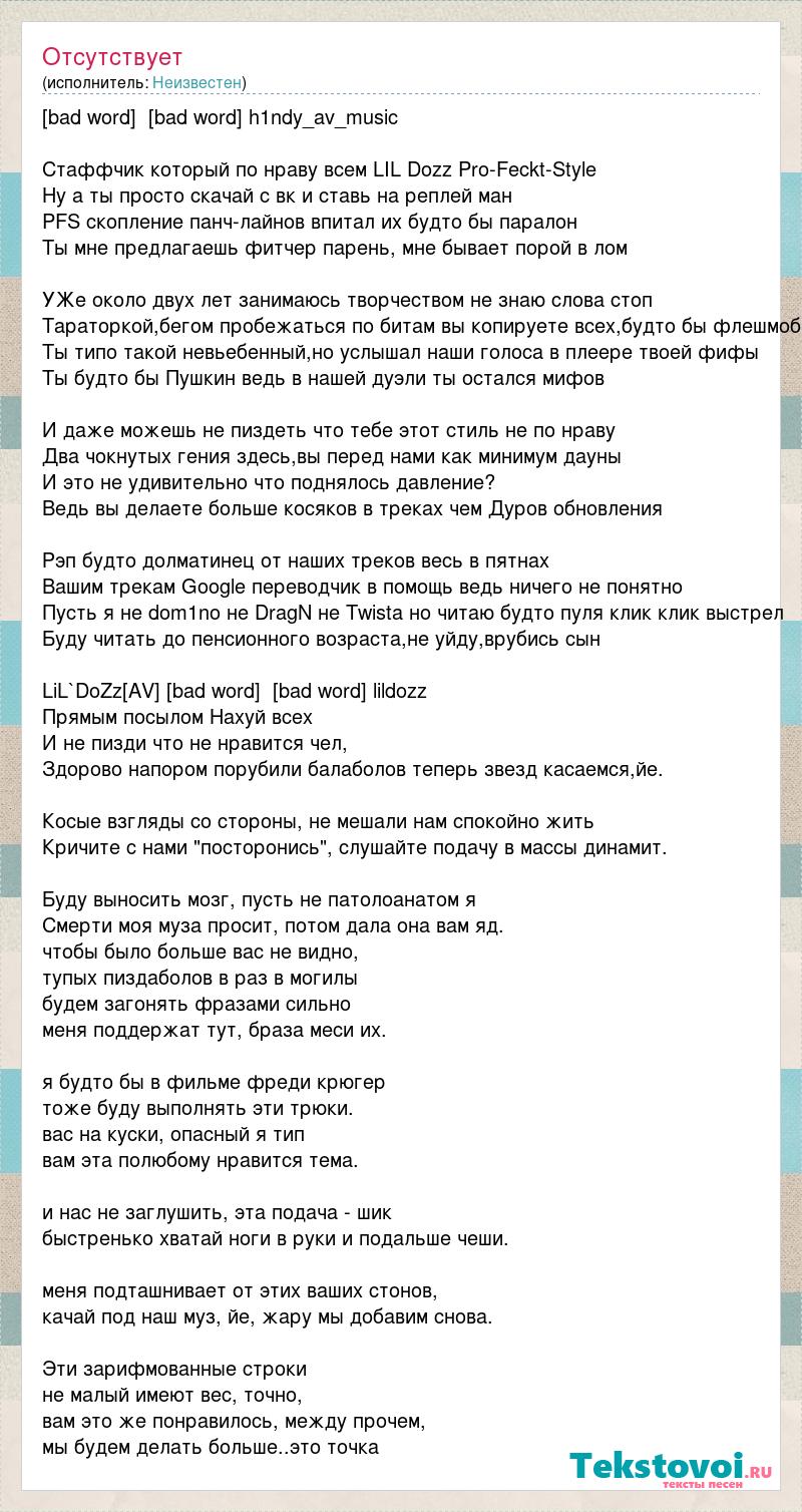 [bad word] [bad word] h1ndy_av_music Стаффчик который по нраву всем LIL Dozz Pro-Feckt-Style Ну а ты просто скачай с вк и ставь на реплей ман PFS скопление панч-лайнов впитал их будто бы паралон Ты мне предлагаешь фитчер парень, мне бывает порой в лом УЖе около двух лет занимаюсь творчеством не знаю слова стоп Тараторкой,бегом пробежаться по битам вы копируете всех,будто бы флешмоб Ты типо такой невьебенный,но услышал наши голоса в плеере твоей фифы Ты будто бы Пушкин ведь в нашей дуэли ты остался мифов И даже можешь не пиздеть что тебе этот стиль не по нраву Два чокнутых гения здесь,вы перед нами как минимум дауны И это не удивительно что поднялось давление? Ведь вы делаете больше косяков в треках чем Дуров обновления Рэп будто долматинец от наших треков весь в пятнах Вашим трекам Google переводчик в помощь ведь ничего не понятно Пусть я не dom1no не DragN не Twista но читаю будто пуля клик клик выстрел Буду читать до пенсионного возраста,не уйду,врубись сын LiL`DoZz[AV] [bad word] [bad word] lildozz Прямым посылом Нахуй всех И не пизди что не нравится чел, Здорово напором порубили балаболов теперь звезд касаемся,йе. Косые взгляды со стороны, не мешали нам спокойно жить Кричите с нами "посторонись", слушайте подачу в массы динамит. Буду выносить мозг, пусть не патолоанатом я Смерти моя муза просит, потом дала она вам яд. чтобы было больше вас не видно, тупых пиздаболов в раз в могилы будем загонять фразами сильно меня поддержат тут, браза меси их. я будто бы в фильме фреди крюгер тоже буду выполнять эти трюки. вас на куски, опасный я тип вам эта полюбому нравится тема. и нас не заглушить, эта подача - шик быстренько хватай ноги в руки и подальше чеши. меня подташнивает от этих ваших стонов, качай под наш муз, йе, жару мы добавим снова. Эти зарифмованные строки не малый имеют вес, точно, вам это же понравилось, между прочем, мы будем делать больше..это точка
