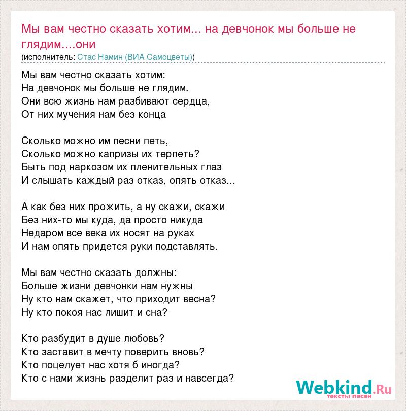 Мы вам честно сказать хотим: На девчонок мы больше не глядим. Они всю жизнь нам разбивают сердца, От них мучения нам без конца Сколько можно им песни петь, Сколько можно капризы их терпеть? Быть под наркозом их пленительных глаз И слышать каждый раз отказ, опять отказ... А как без них прожить, а ну скажи, скажи Без них-то мы куда, да просто никуда Недаром все века их носят на руках И нам опять придется руки подставлять. Мы вам честно сказать должны: Больше жизни девчонки нам нужны Ну кто нам скажет, что приходит весна? Ну кто покоя нас лишит и сна? Кто разбудит в душе любовь? Кто заставит в мечту поверить вновь? Кто поцелует нас хотя б иногда? Кто с нами жизнь разделит раз и навсегда?