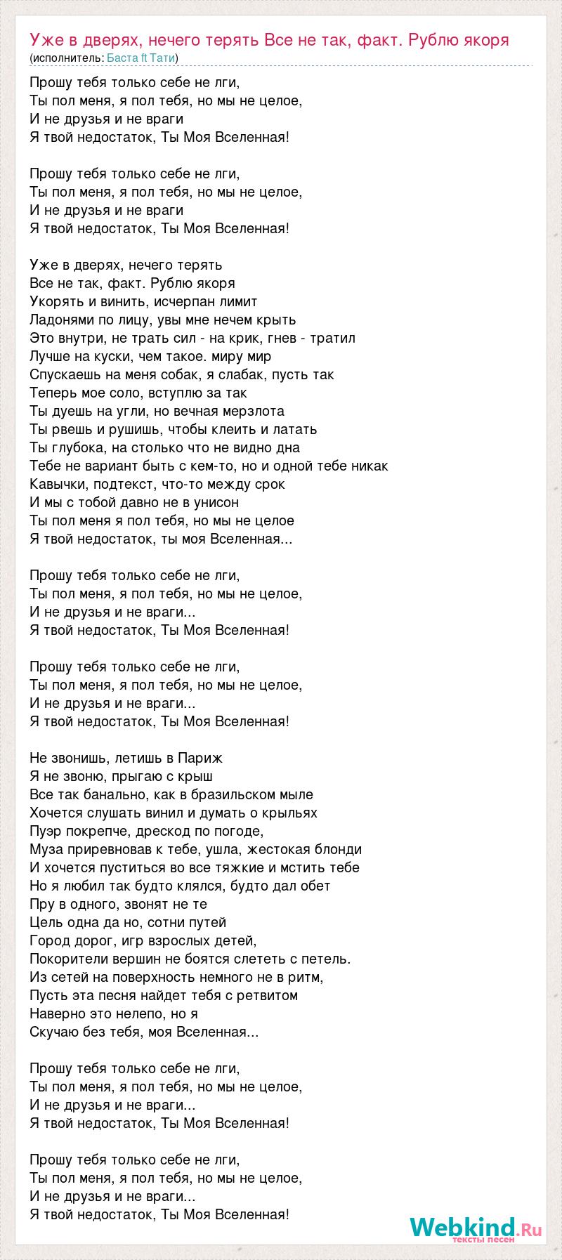 Прошу тебя только себе не лги, Ты пол меня, я пол тебя, но мы не целое, И не друзья и не враги Я твой недостаток, Ты Моя Вселенная! Прошу тебя только себе не лги, Ты пол меня, я пол тебя, но мы не целое, И не друзья и не враги Я твой недостаток, Ты Моя Вселенная! Уже в дверях, нечего терять Все не так, факт. Рублю якоря Укорять и винить, исчерпан лимит Ладонями по лицу, увы мне нечем крыть Это внутри, не трать сил - на крик, гнев - тратил Лучше на куски, чем такое. миру мир Спускаешь на меня собак, я слабак, пусть так Теперь мое соло, вступлю за так Ты дуешь на угли, но вечная мерзлота Ты рвешь и рушишь, чтобы клеить и латать Ты глубока, на столько что не видно дна Тебе не вариант быть с кем-то, но и одной тебе никак Кавычки, подтекст, что-то между срок И мы с тобой давно не в унисон Ты пол меня я пол тебя, но мы не целое Я твой недостаток, ты моя Вселенная... Прошу тебя только себе не лги, Ты пол меня, я пол тебя, но мы не целое, И не друзья и не враги... Я твой недостаток, Ты Моя Вселенная! Прошу тебя только себе не лги, Ты пол меня, я пол тебя, но мы не целое, И не друзья и не враги... Я твой недостаток, Ты Моя Вселенная! Не звонишь, летишь в Париж Я не звоню, прыгаю с крыш Все так банально, как в бразильском мыле Хочется слушать винил и думать о крыльях Пуэр покрепче, дрескод по погоде, Муза приревновав к тебе, ушла, жестокая блонди И хочется пуститься во все тяжкие и мстить тебе Но я любил так будто клялся, будто дал обет Пру в одного, звонят не те Цель одна да но, сотни путей Город дорог, игр взрослых детей, Покорители вершин не боятся слететь с петель. Из сетей на поверхность немного не в ритм, Пусть эта песня найдет тебя с ретвитом Наверно это нелепо, но я Скучаю без тебя, моя Вселенная... Прошу тебя только себе не лги, Ты пол меня, я пол тебя, но мы не целое, И не друзья и не враги... Я твой недостаток, Ты Моя Вселенная! Прошу тебя только себе не лги, Ты пол меня, я пол тебя, но мы не целое, И не друзья и не враги... Я твой недостаток, Ты Моя Вселенная!