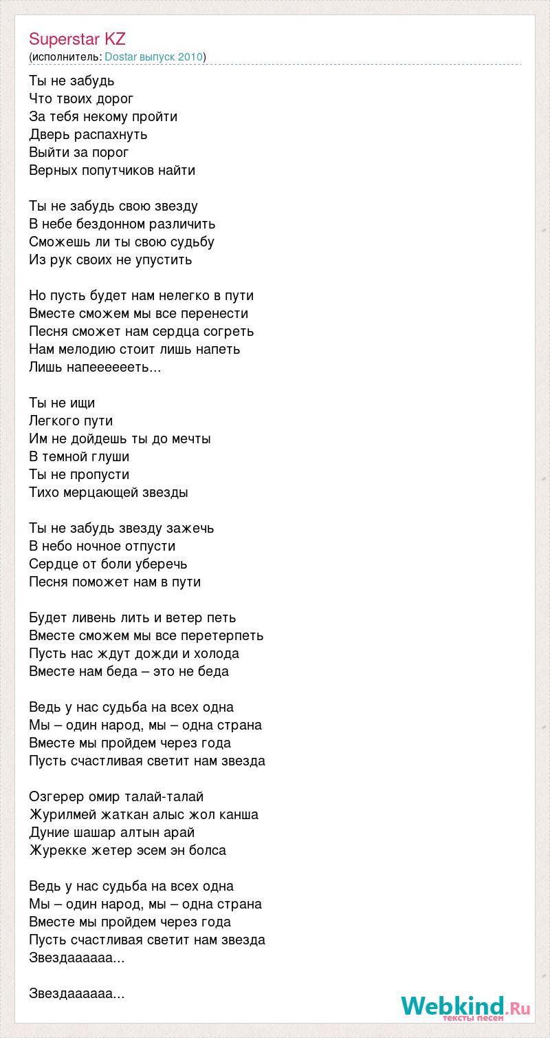 Ты не забудь Что твоих дорог За тебя некому пройти Дверь распахнуть Выйти за порог Верных попутчиков найти Ты не забудь свою звезду В небе бездонном различить Сможешь ли ты свою судьбу Из рук своих не упустить Но пусть будет нам нелегко в пути Вместе сможем мы все перенести Песня сможет нам сердца согреть Нам мелодию стоит лишь напеть Лишь напееееееть... Ты не ищи Легкого пути Им не дойдешь ты до мечты В темной глуши Ты не пропусти Тихо мерцающей звезды Ты не забудь звезду зажечь В небо ночное отпусти Сердце от боли уберечь Песня поможет нам в пути Будет ливень лить и ветер петь Вместе сможем мы все перетерпеть Пусть нас ждут дожди и холода Вместе нам беда – это не беда Ведь у нас судьба на всех одна Мы – один народ, мы – одна страна Вместе мы пройдем через года Пусть счастливая светит нам звезда Озгерер омир талай-талай Журилмей жаткан алыс жол канша Дуние шашар алтын арай Журекке жетер эсем эн болса Ведь у нас судьба на всех одна Мы – один народ, мы – одна страна Вместе мы пройдем через года Пусть счастливая светит нам звезда Звездаааааа... Звездаааааа...