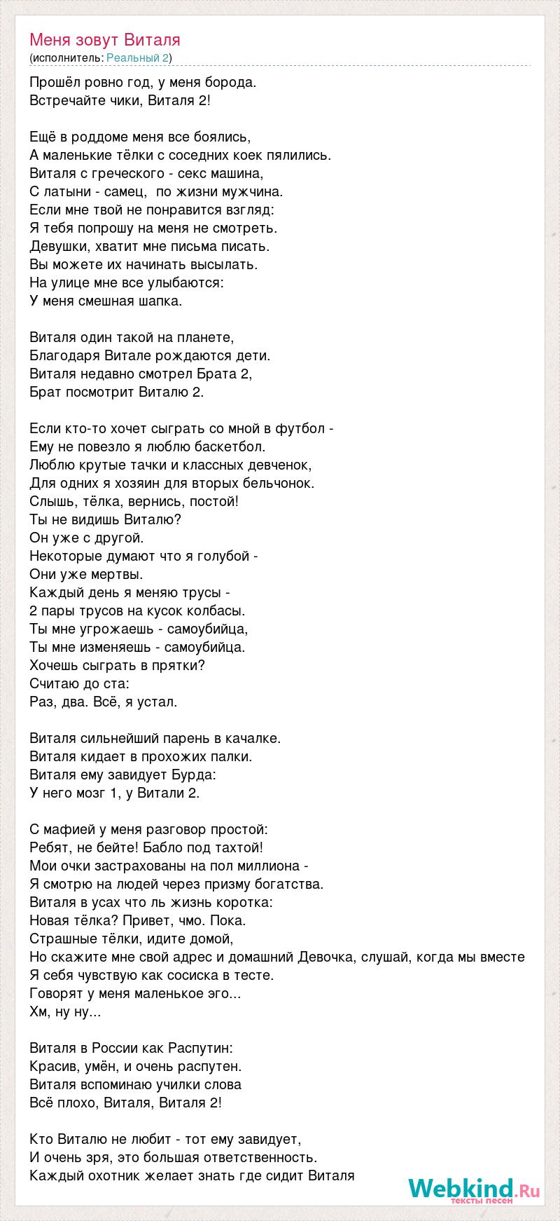 Прошёл ровно год, у меня борода. Встречайте чики, Виталя 2! Ещё в роддоме меня все боялись, А маленькие тёлки с соседних коек пялились. Виталя с греческого - секс машина, С латыни - самец, по жизни мужчина. Если мне твой не понравится взгляд: Я тебя попрошу на меня не смотреть. Девушки, хватит мне письма писать. Вы можете их начинать высылать. На улице мне все улыбаются: У меня смешная шапка. Виталя один такой на планете, Благодаря Витале рождаются дети. Виталя недавно смотрел Брата 2, Брат посмотрит Виталю 2. Если кто-то хочет сыграть со мной в футбол - Ему не повезло я люблю баскетбол. Люблю крутые тачки и классных девченок, Для одних я хозяин для вторых бельчонок. Слышь, тёлка, вернись, постой! Ты не видишь Виталю? Он уже с другой. Некоторые думают что я голубой - Они уже мертвы. Каждый день я меняю трусы - 2 пары трусов на кусок колбасы. Ты мне угрожаешь - самоубийца, Ты мне изменяешь - самоубийца. Хочешь сыграть в прятки? Считаю до ста: Раз, два. Всё, я устал. Виталя сильнейший парень в качалке. Виталя кидает в прохожих палки. Виталя ему завидует Бурда: У него мозг 1, у Витали 2. С мафией у меня разговор простой: Ребят, не бейте! Бабло под тахтой! Мои очки застрахованы на пол миллиона - Я смотрю на людей через призму богатства. Виталя в усах что ль жизнь коротка: Новая тёлка? Привет, чмо. Пока. Страшные тёлки, идите домой, Но скажите мне свой адрес и домашний Девочка, слушай, когда мы вместе Я себя чувствую как сосиска в тесте. Говорят у меня маленькое эго... Хм, ну ну... Виталя в России как Распутин: Красив, умён, и очень распутен. Виталя вспоминаю училки слова Всё плохо, Виталя, Виталя 2! Кто Виталю не любит - тот ему завидует, И очень зря, это большая ответственность. Каждый охотник желает знать где сидит Виталя