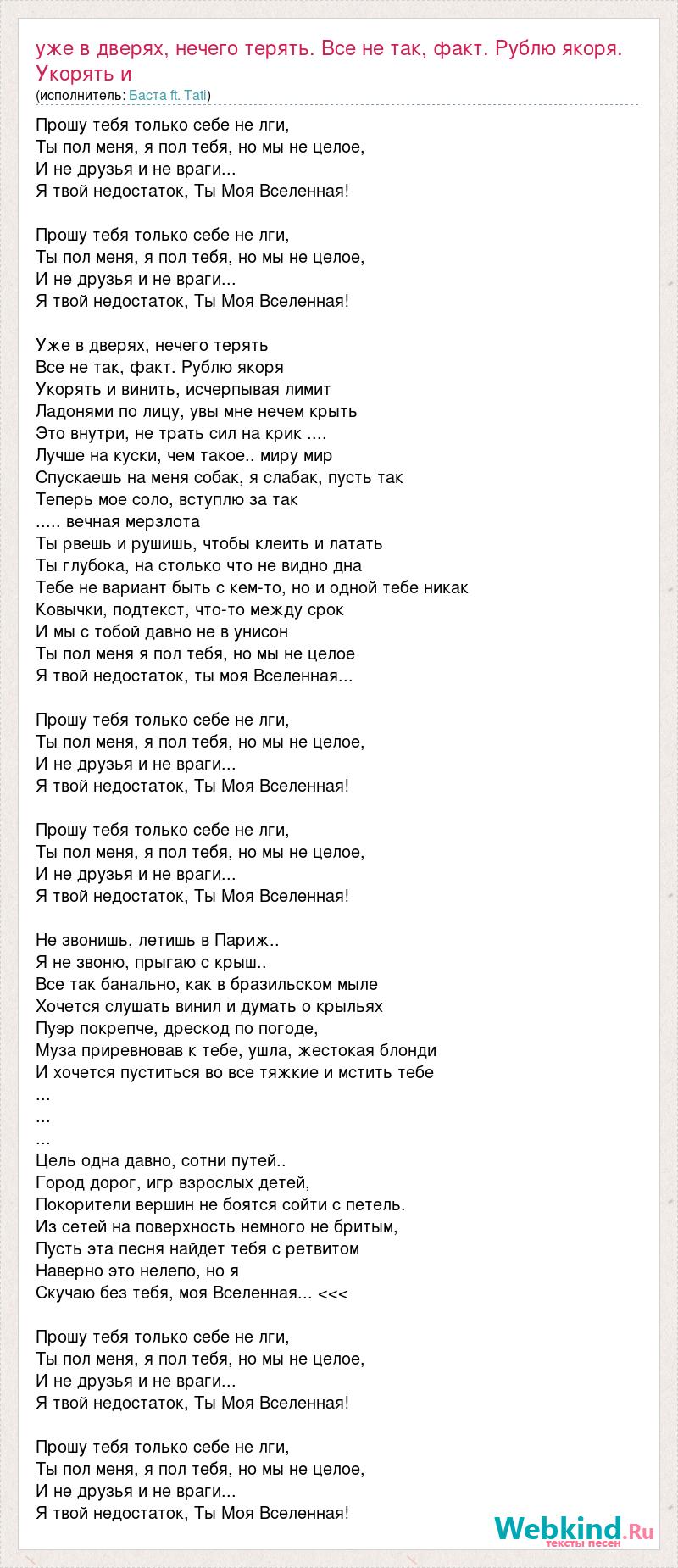 Прошу тебя только себе не лги, Ты пол меня, я пол тебя, но мы не целое, И не друзья и не враги... Я твой недостаток, Ты Моя Вселенная! Прошу тебя только себе не лги, Ты пол меня, я пол тебя, но мы не целое, И не друзья и не враги... Я твой недостаток, Ты Моя Вселенная! Уже в дверях, нечего терять Все не так, факт. Рублю якоря Укорять и винить, исчерпывая лимит Ладонями по лицу, увы мне нечем крыть Это внутри, не трать сил на крик .... Лучше на куски, чем такое.. миру мир Спускаешь на меня собак, я слабак, пусть так Теперь мое соло, вступлю за так ..... вечная мерзлота Ты рвешь и рушишь, чтобы клеить и латать Ты глубока, на столько что не видно дна Тебе не вариант быть с кем-то, но и одной тебе никак Ковычки, подтекст, что-то между срок И мы с тобой давно не в унисон Ты пол меня я пол тебя, но мы не целое Я твой недостаток, ты моя Вселенная... Прошу тебя только себе не лги, Ты пол меня, я пол тебя, но мы не целое, И не друзья и не враги... Я твой недостаток, Ты Моя Вселенная! Прошу тебя только себе не лги, Ты пол меня, я пол тебя, но мы не целое, И не друзья и не враги... Я твой недостаток, Ты Моя Вселенная! Не звонишь, летишь в Париж.. Я не звоню, прыгаю с крыш.. Все так банально, как в бразильском мыле Хочется слушать винил и думать о крыльях Пуэр покрепче, дрескод по погоде, Муза приревновав к тебе, ушла, жестокая блонди И хочется пуститься во все тяжкие и мстить тебе ... ... ... Цель одна давно, сотни путей.. Город дорог, игр взрослых детей, Покорители вершин не боятся сойти с петель. Из сетей на поверхность немного не бритым, Пусть эта песня найдет тебя с ретвитом Наверно это нелепо, но я Скучаю без тебя, моя Вселенная... <<< Прошу тебя только себе не лги, Ты пол меня, я пол тебя, но мы не целое, И не друзья и не враги... Я твой недостаток, Ты Моя Вселенная! Прошу тебя только себе не лги, Ты пол меня, я пол тебя, но мы не целое, И не друзья и не враги... Я твой недостаток, Ты Моя Вселенная!